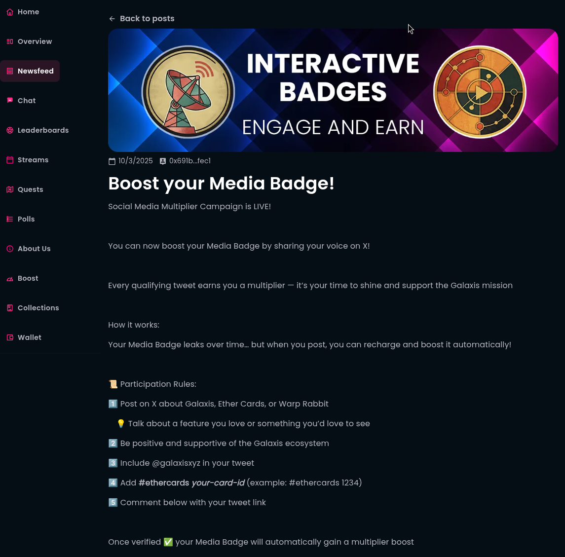 The Social Media Challenge combines several Galaxis features into a seamless and rewarding workflow.