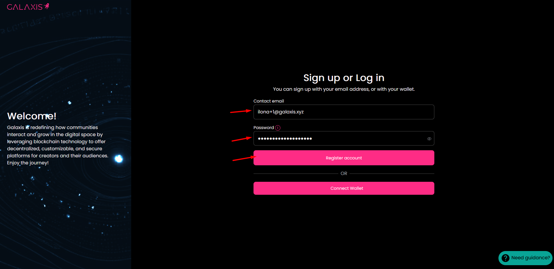 Use this option if you do not yet own a crypto wallet (though one will be required later), or you prefer registering via email.