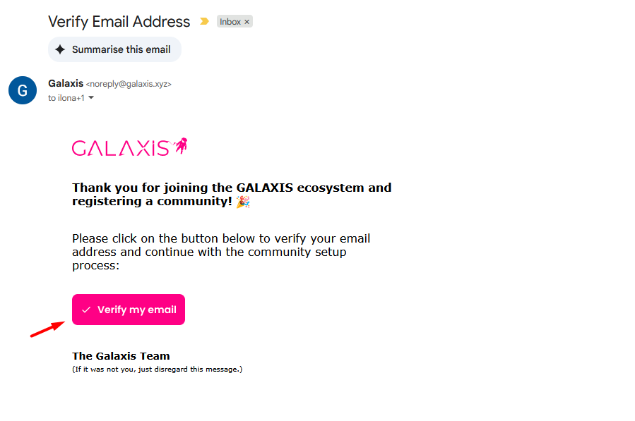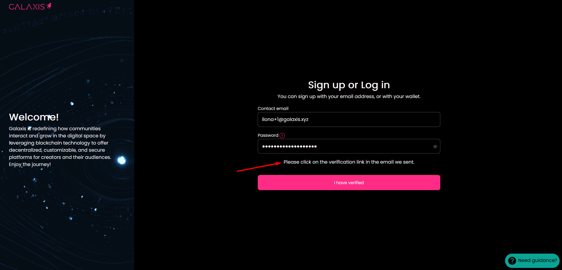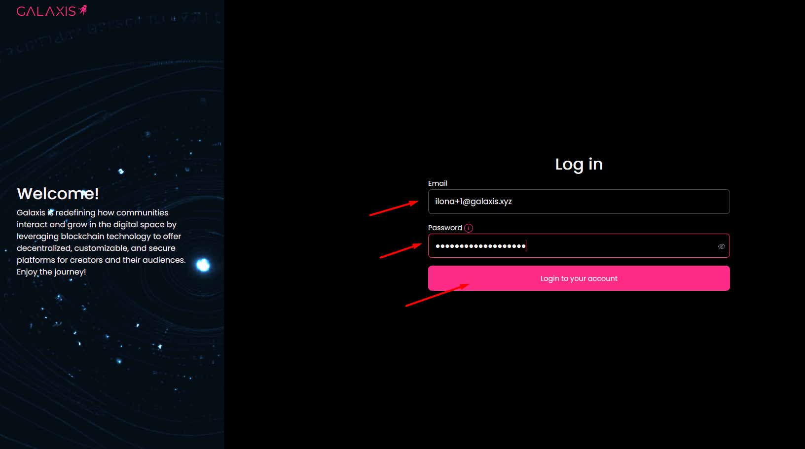 To activate your account, verify your email: open the message sent from Galaxis and click the verification link.