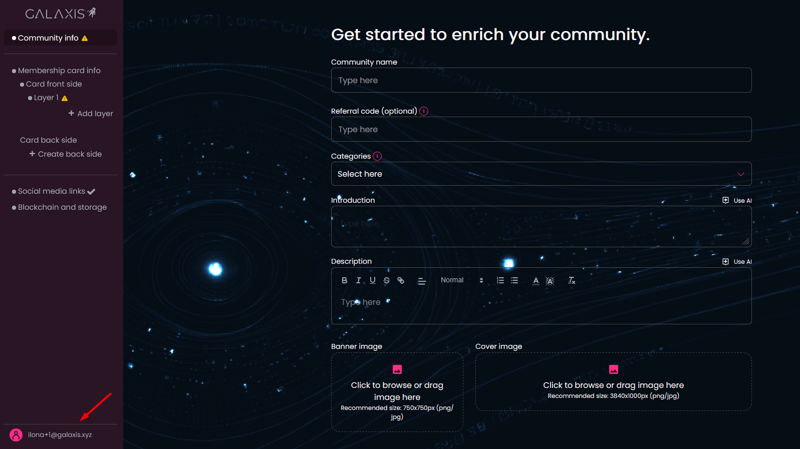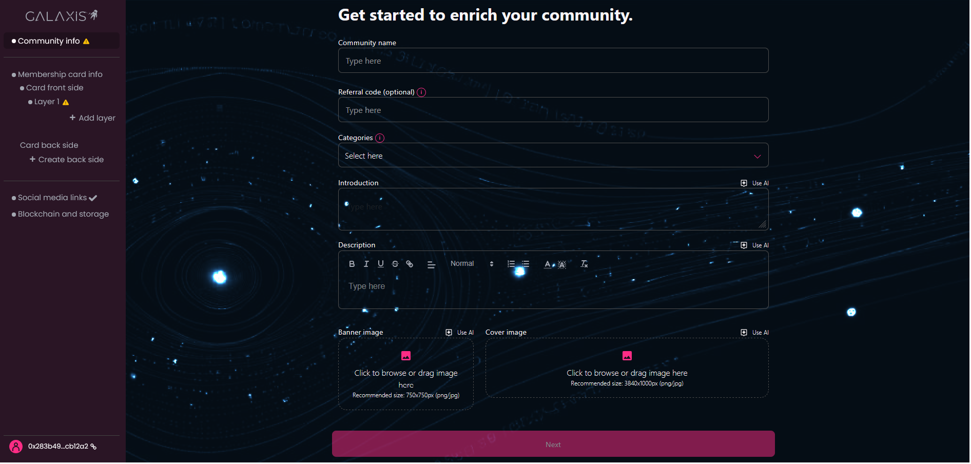 The Community Creator App is the admin interface of the Galaxis platform where community owners can build their website and set up a membership collection.