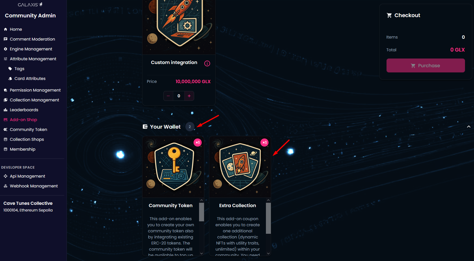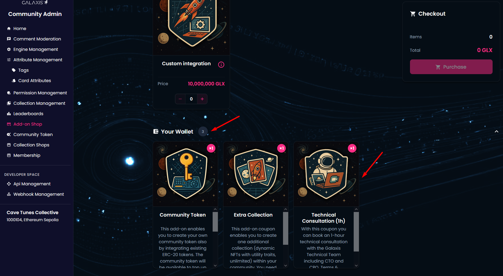 Depending on your community's needs, you can purchase Community Token-, Extra Collection-, 1 hour Technical Consultation- or Custom Integration add-ons.