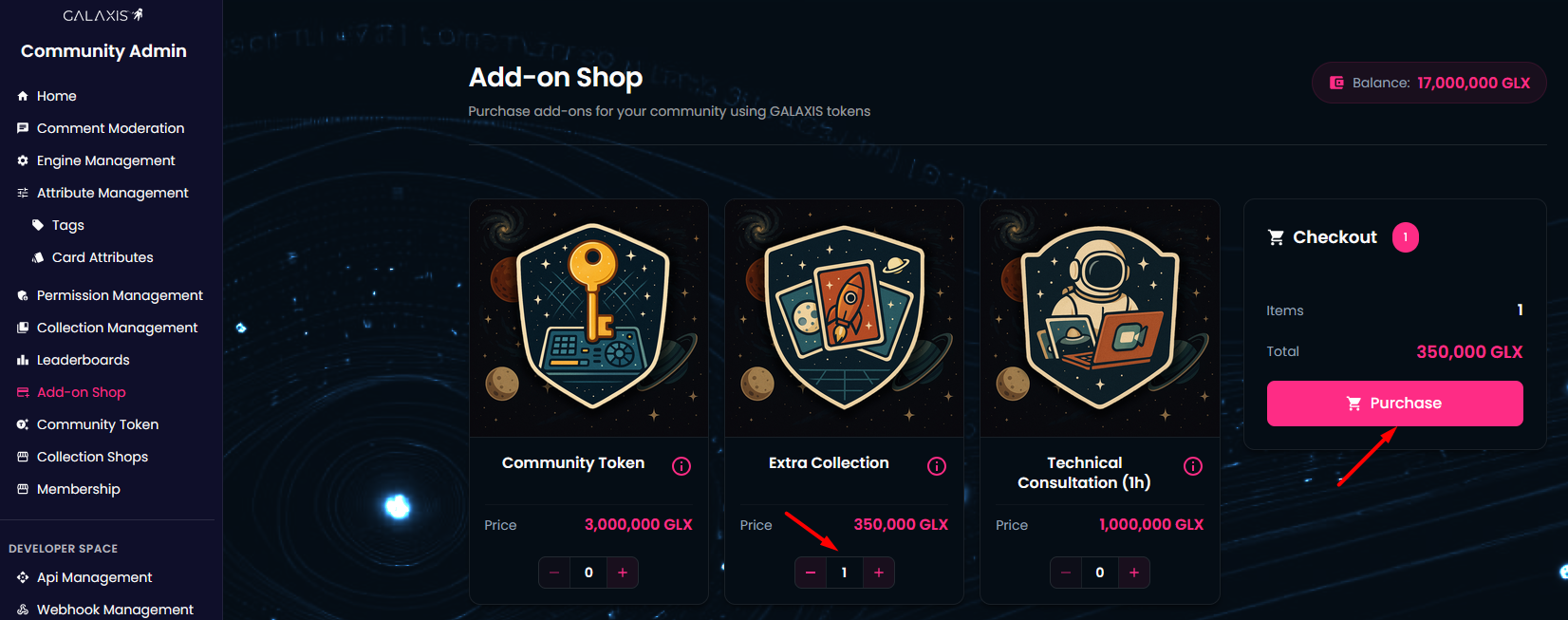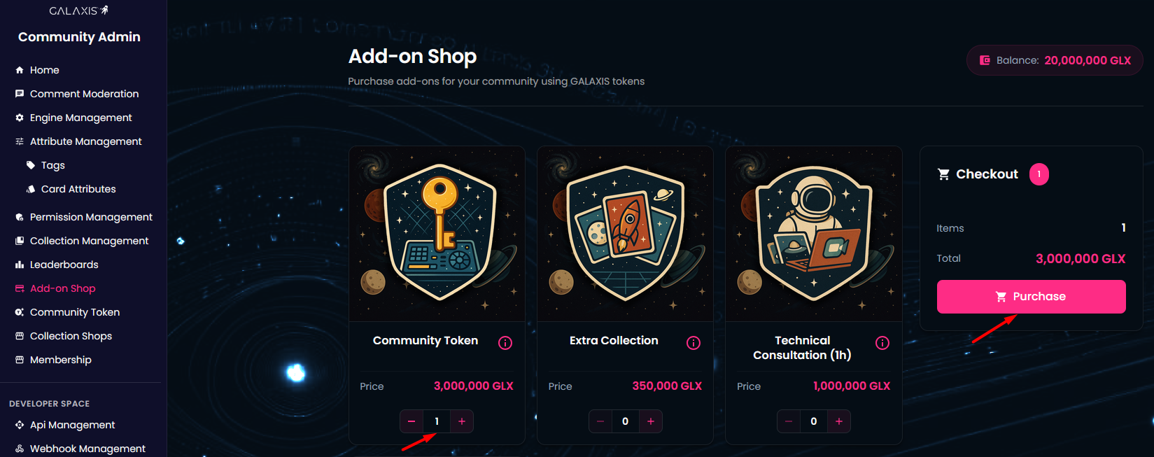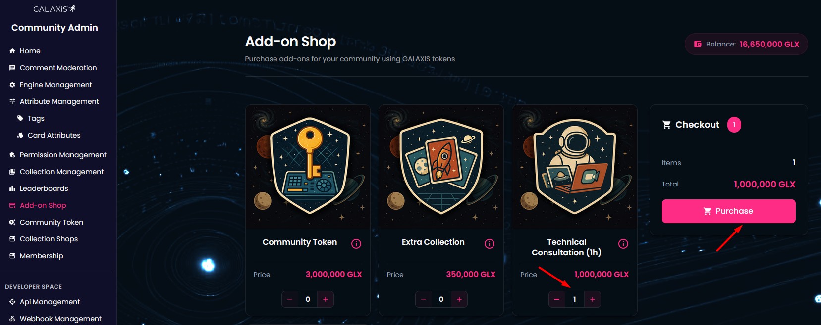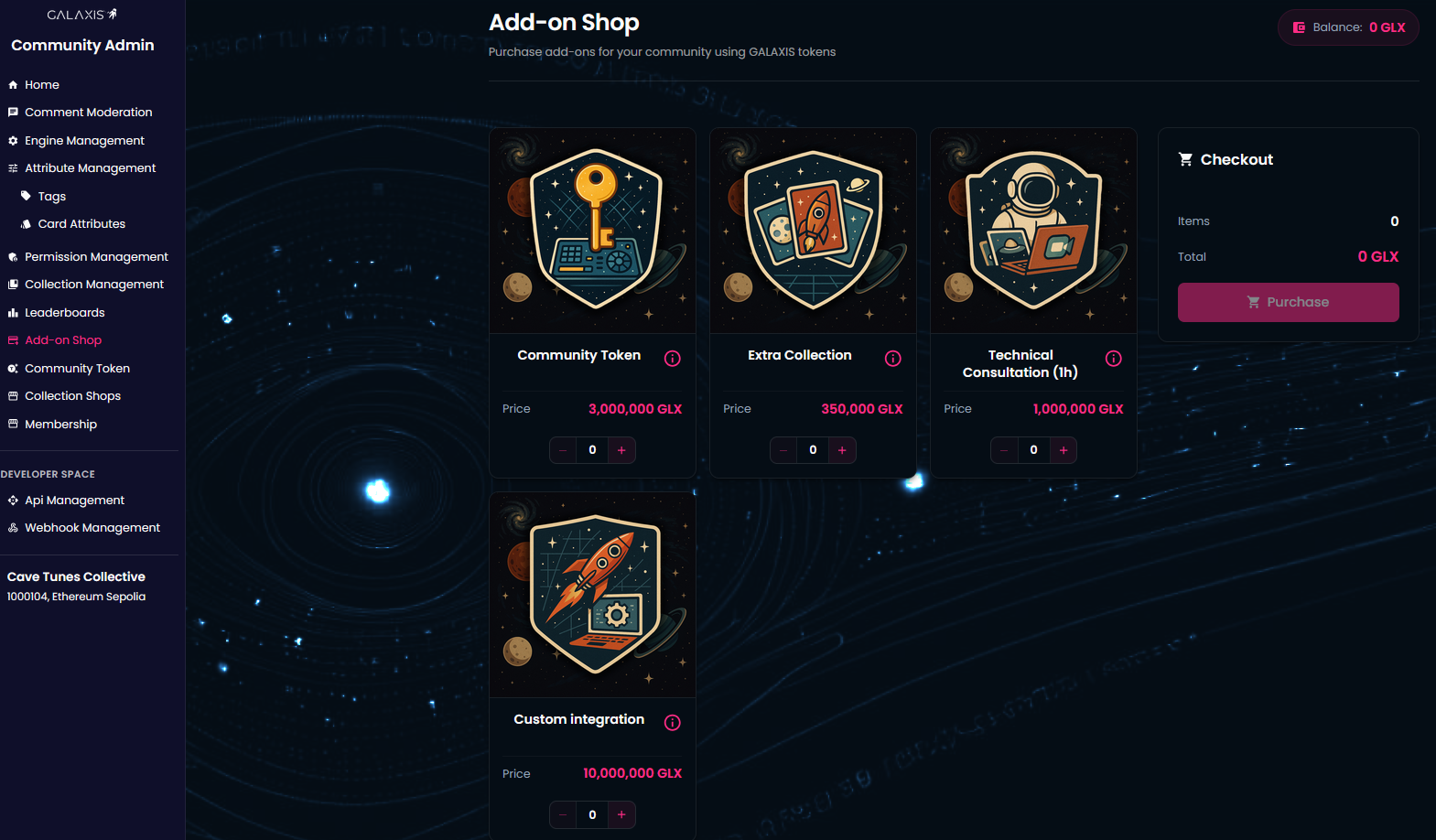 In the Add-on Shop, community owners can buy additional functionalities and features for their community including consultation or custom integration. All prices are defined in GALAXIS tokens.