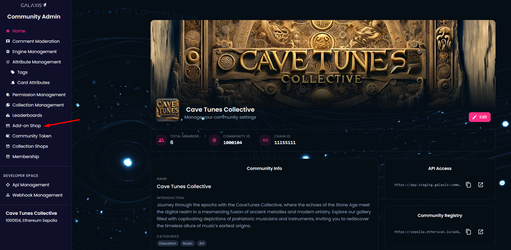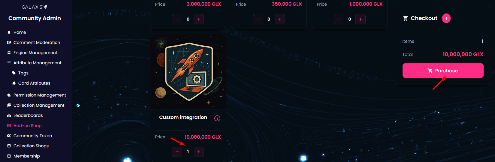 The Add-on Shop is a feature in the Galaxis Community Admin designed exclusively for community owners.