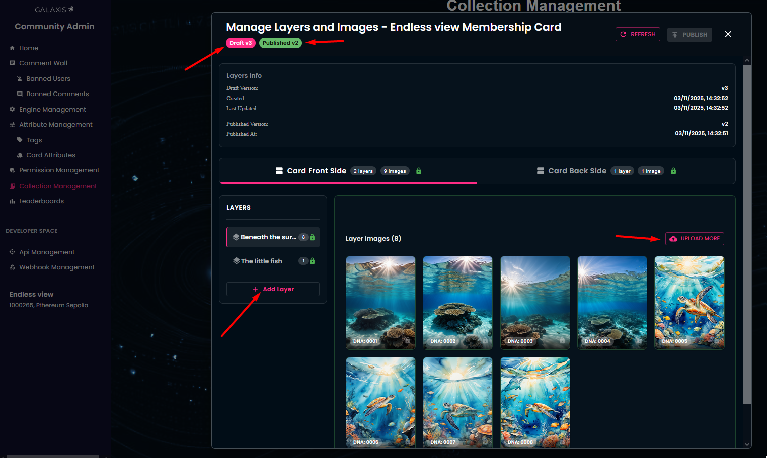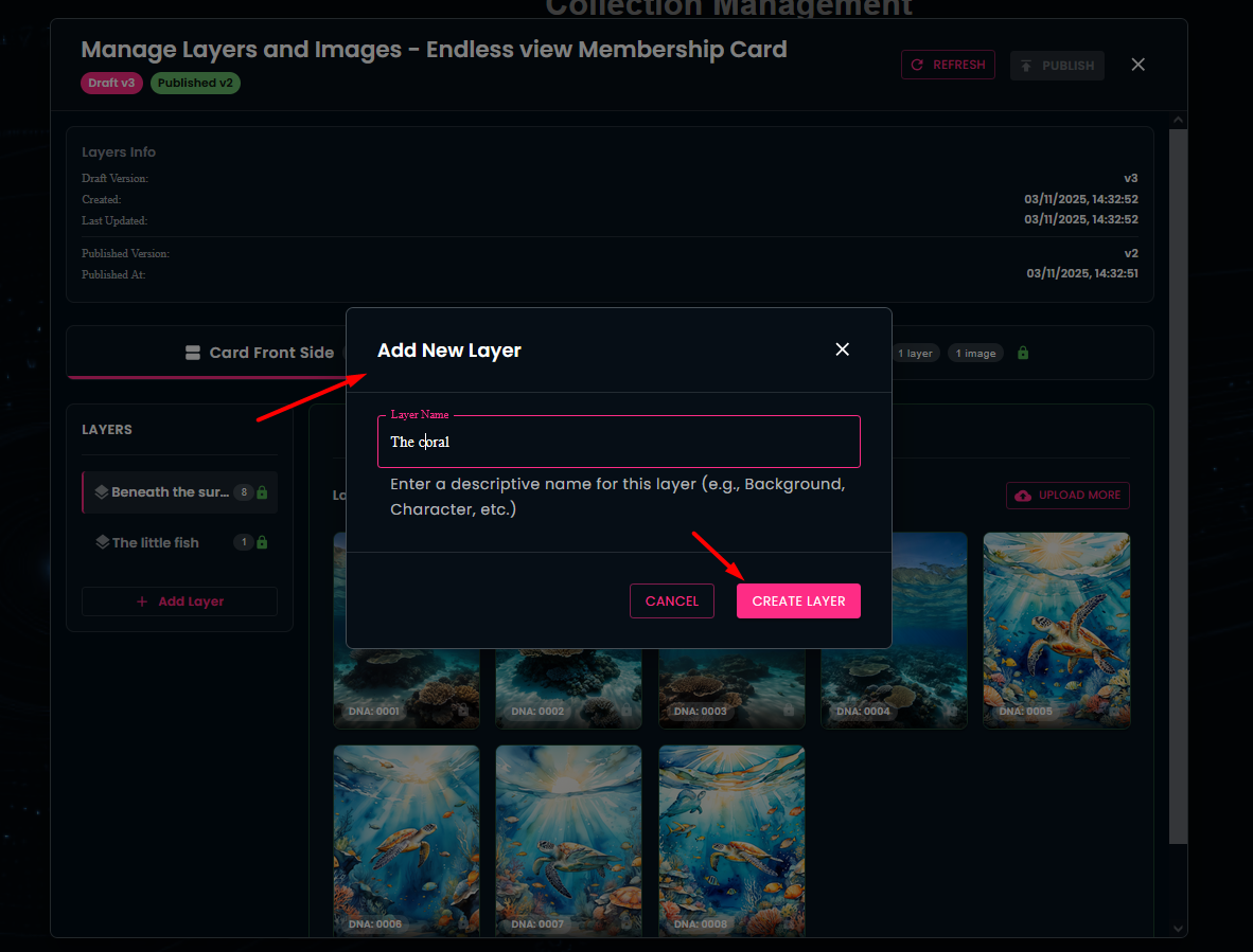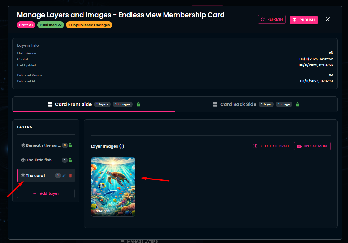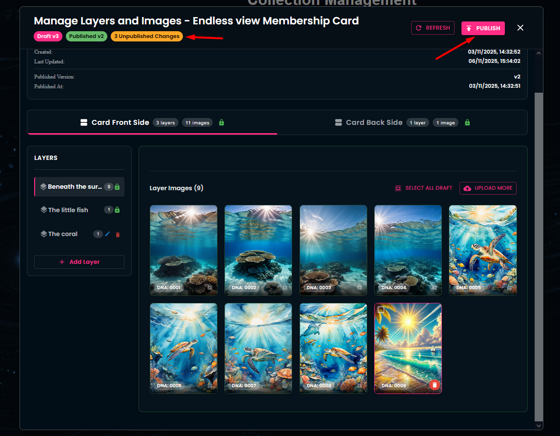 In this section, you have the ability to add new layers and new images to an existing collection. Additionally, the Layer Info area displays an overview of your in-progress work (Draft Version) and of the changes already executed (Published Version).