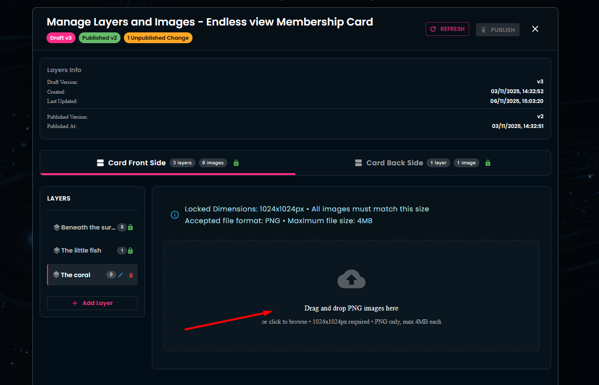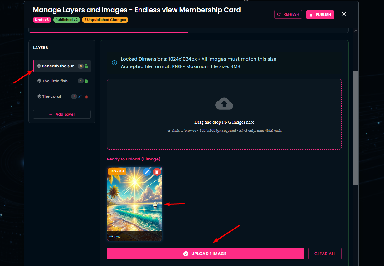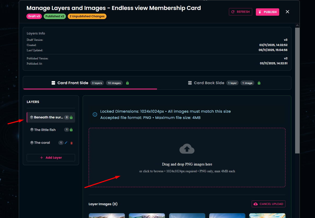 In this section, you have the ability to add new layers and new images to an existing collection. Additionally, the Layer Info area displays an overview of your in-progress work (Draft Version) and of the changes already executed (Published Version).
