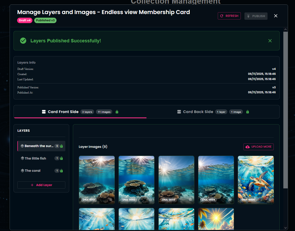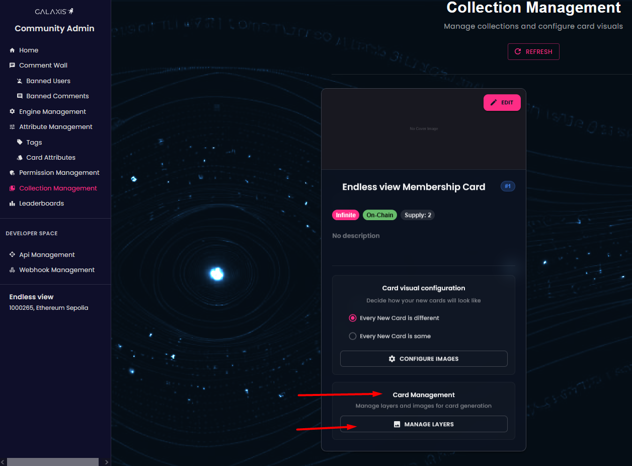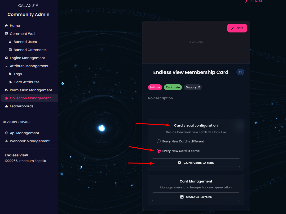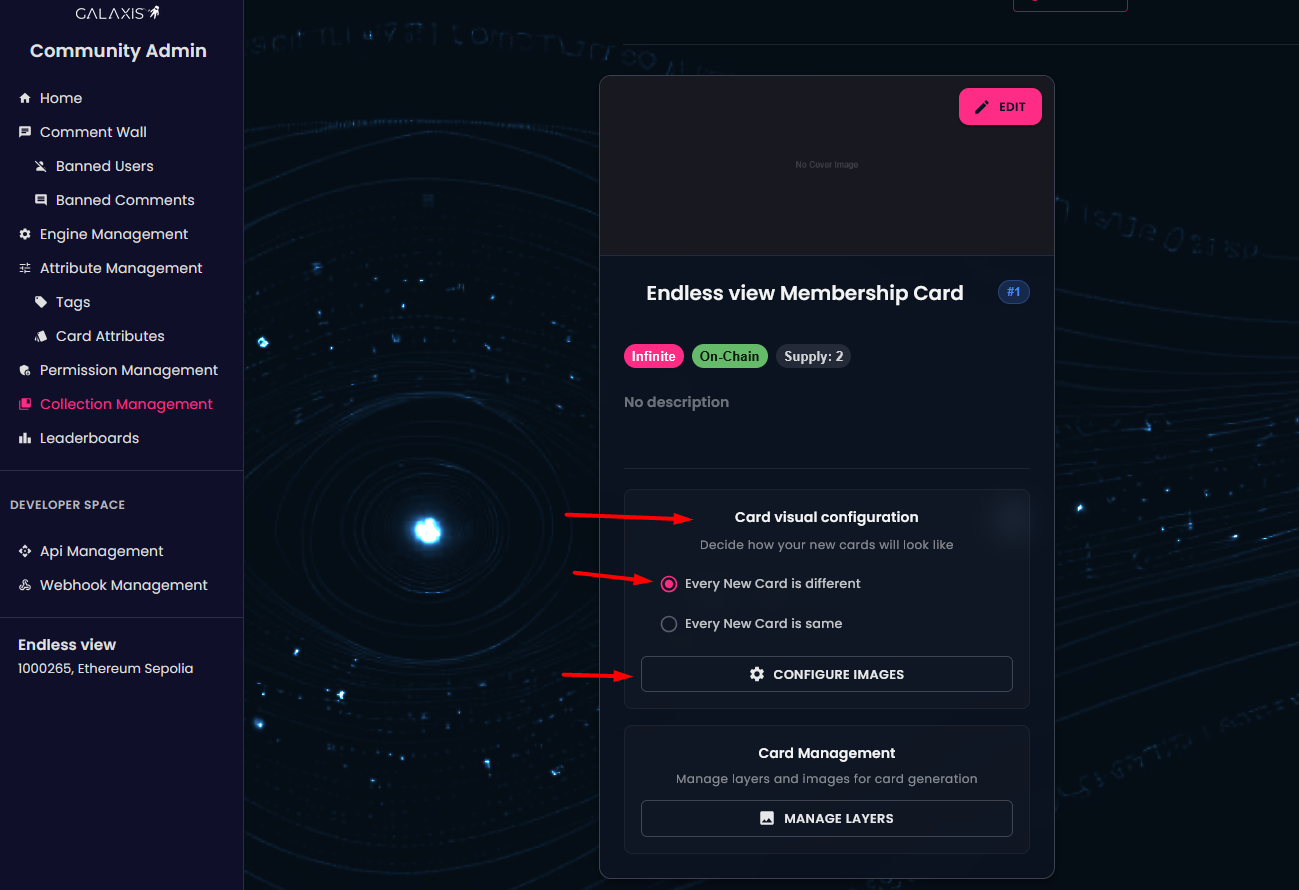 As a community owner you have the ability to make changes to your existing card collections — for example: enabling random generation or opting for identical cards, adding new layers or images, or even excluding images from future card generations.
