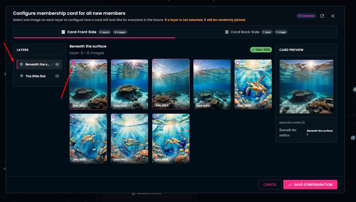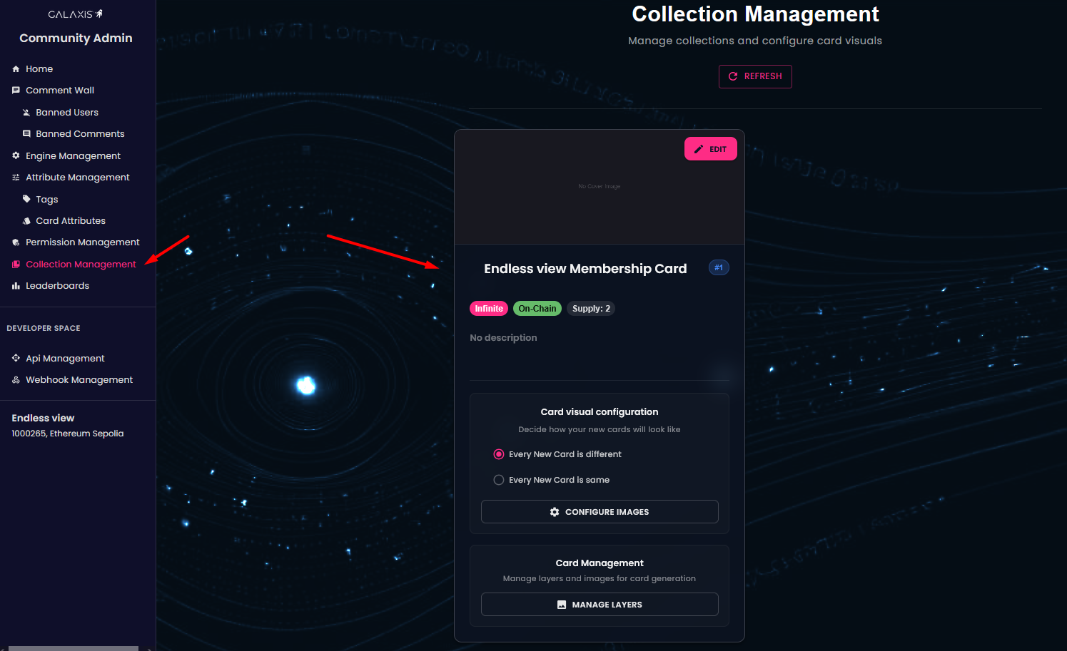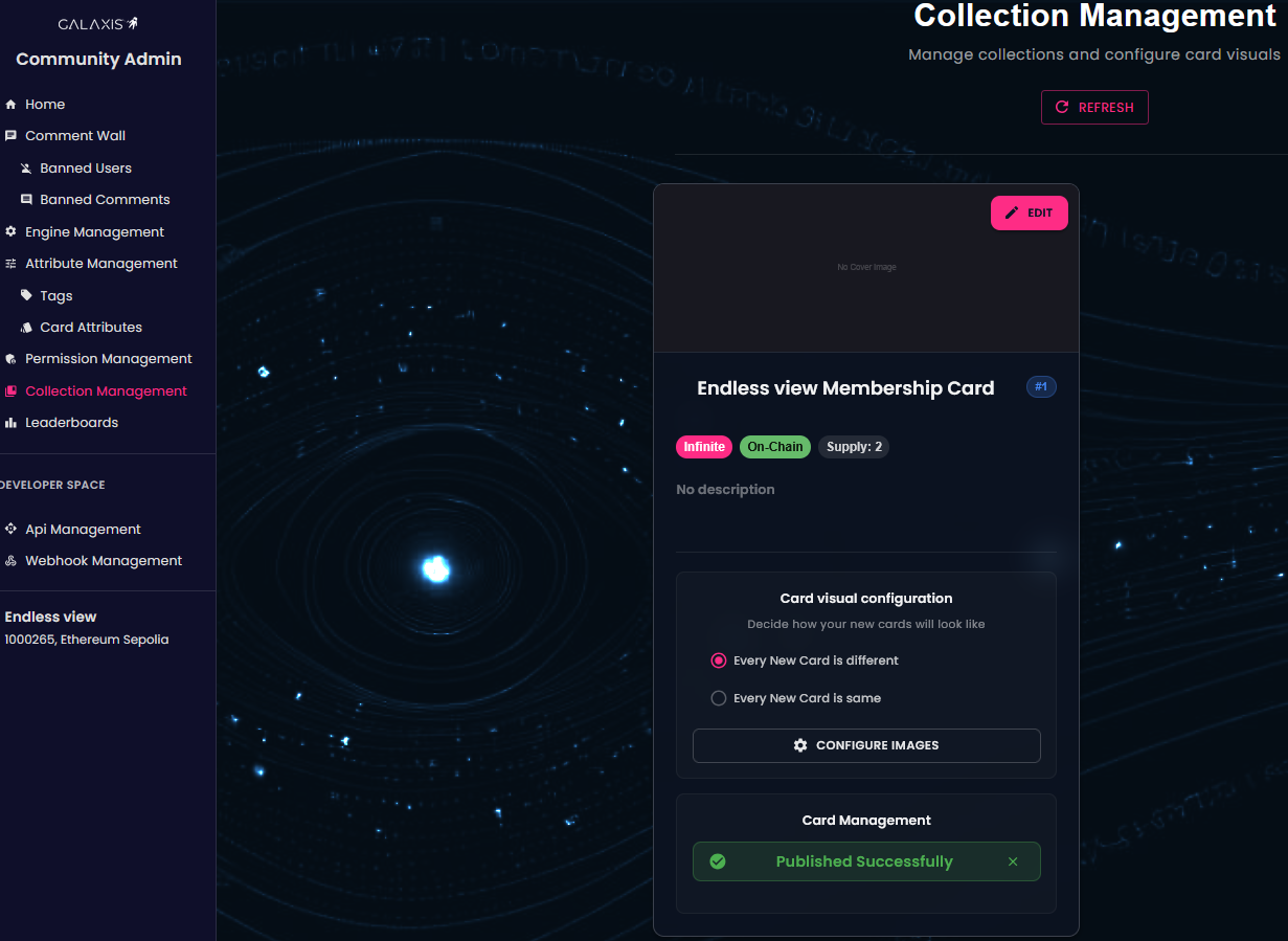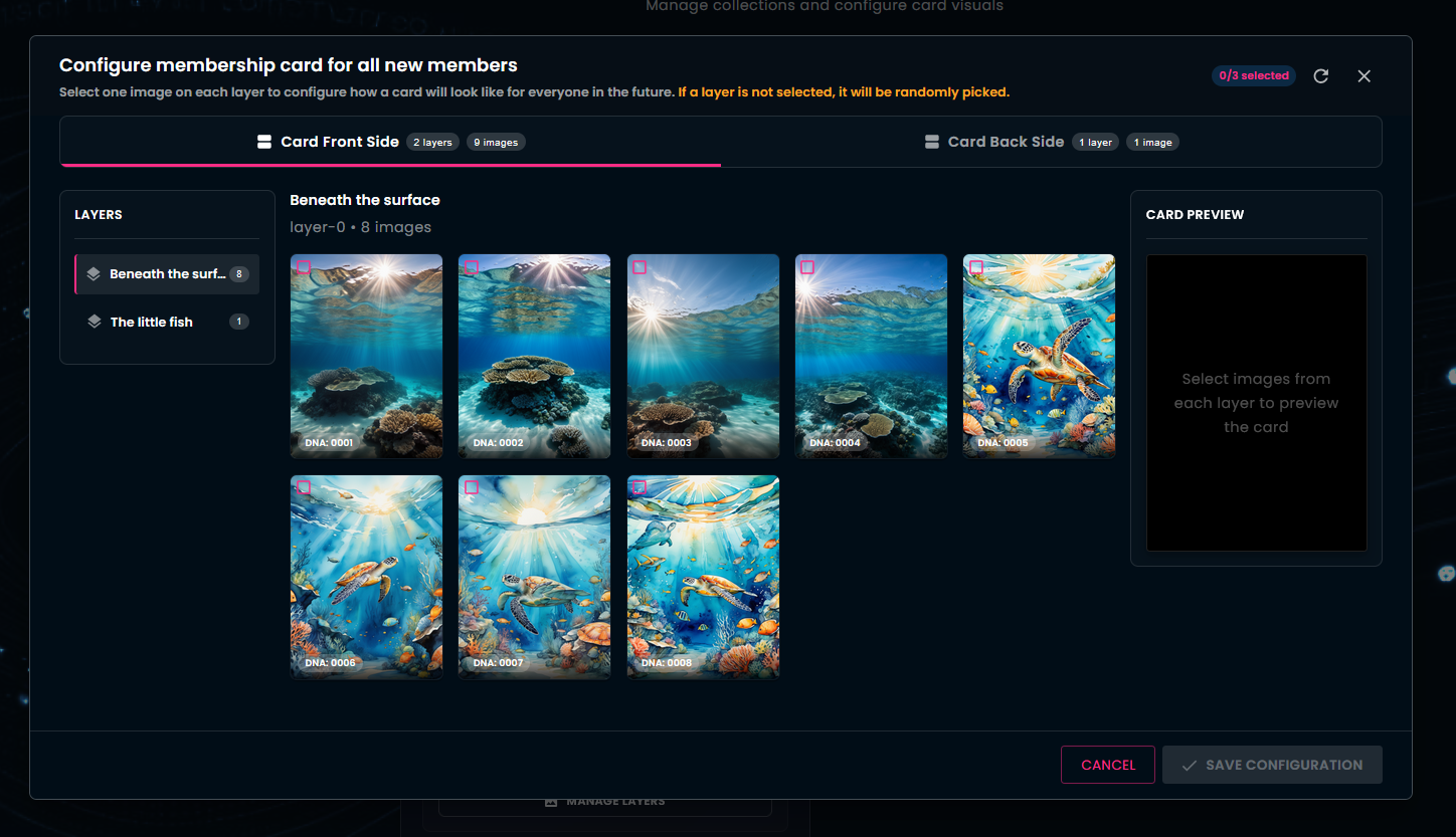As a community owner you have the ability to make changes to your existing card collections — for example: enabling random generation or opting for identical cards, adding new layers or images, or even excluding images from future card generations.