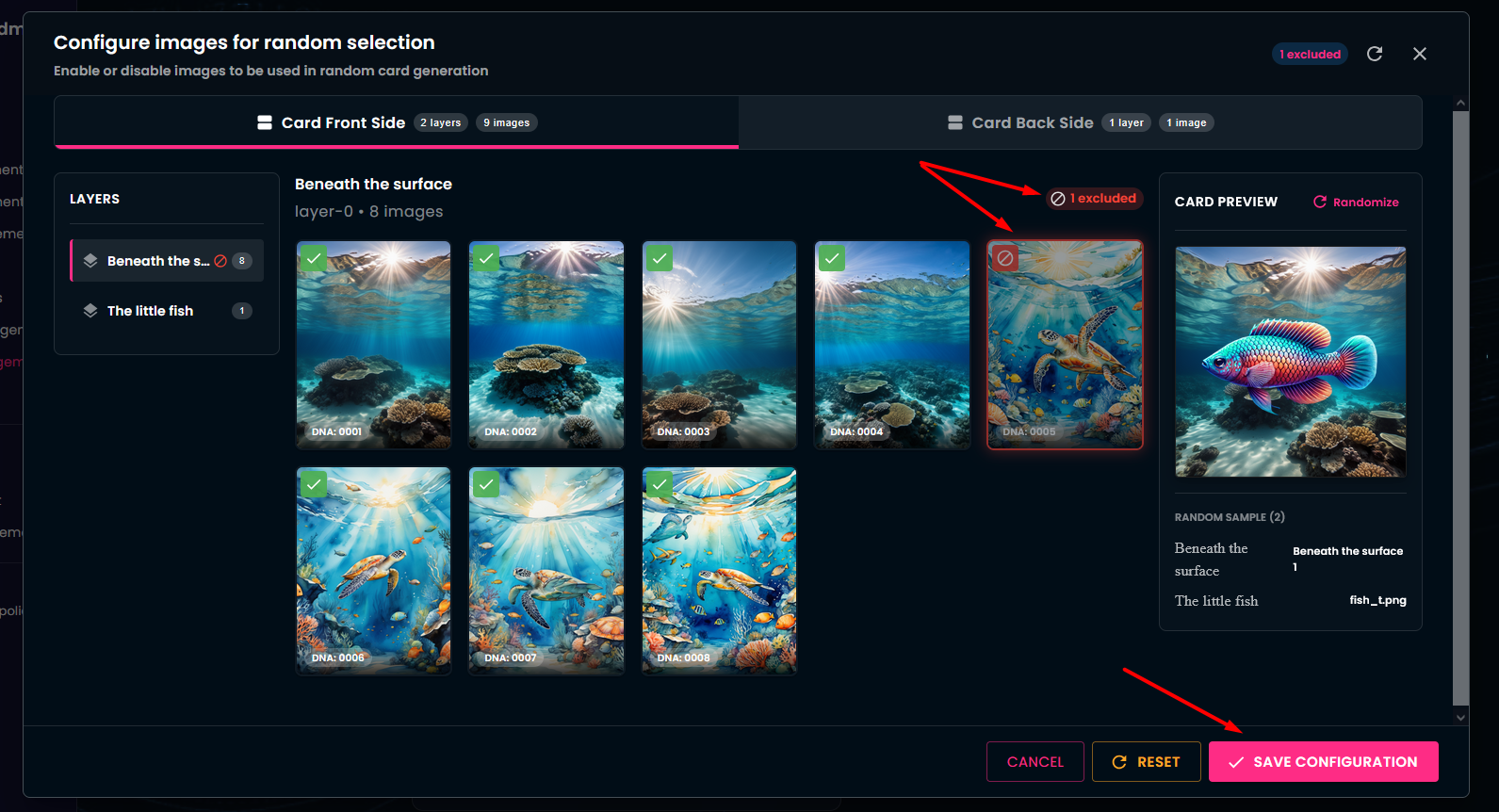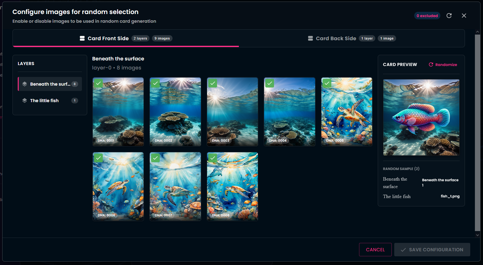 Let us look at Configure Images. Remember, you selected that your images should be generated andomly from the provided images. You can review your already uploaded images, grouped by layer and by card side.