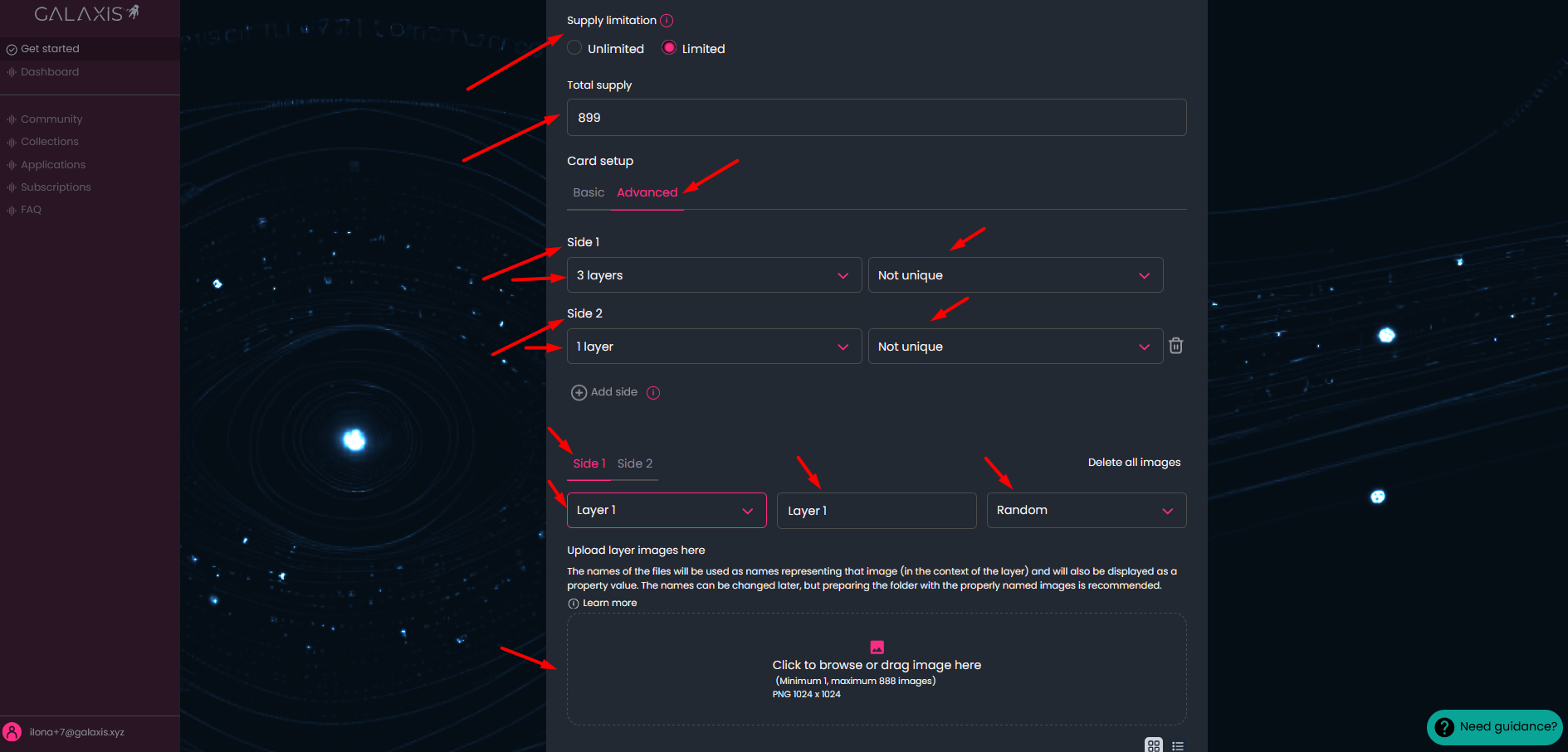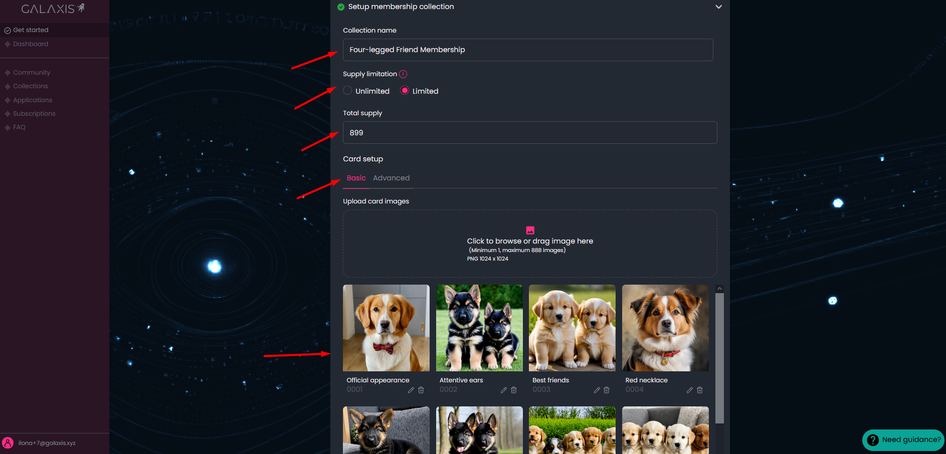 In case of Basic you just Upload images that will be used for the membership cards. You can upload between 1 and maximum 10,000 images in case of an unlimited collection, and between 1 and maximum the number of total supply images in case of limited collection.