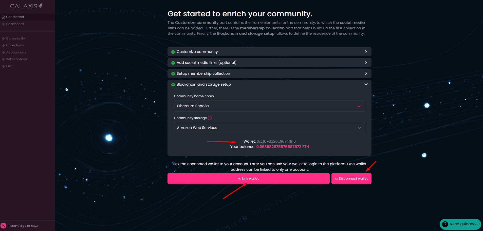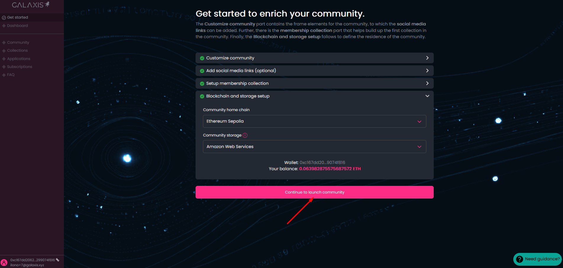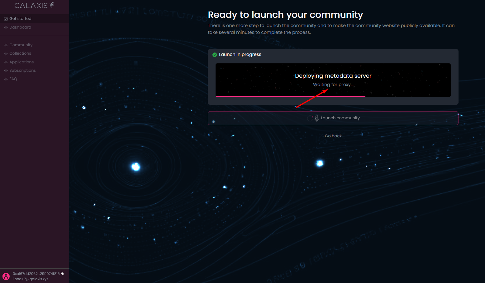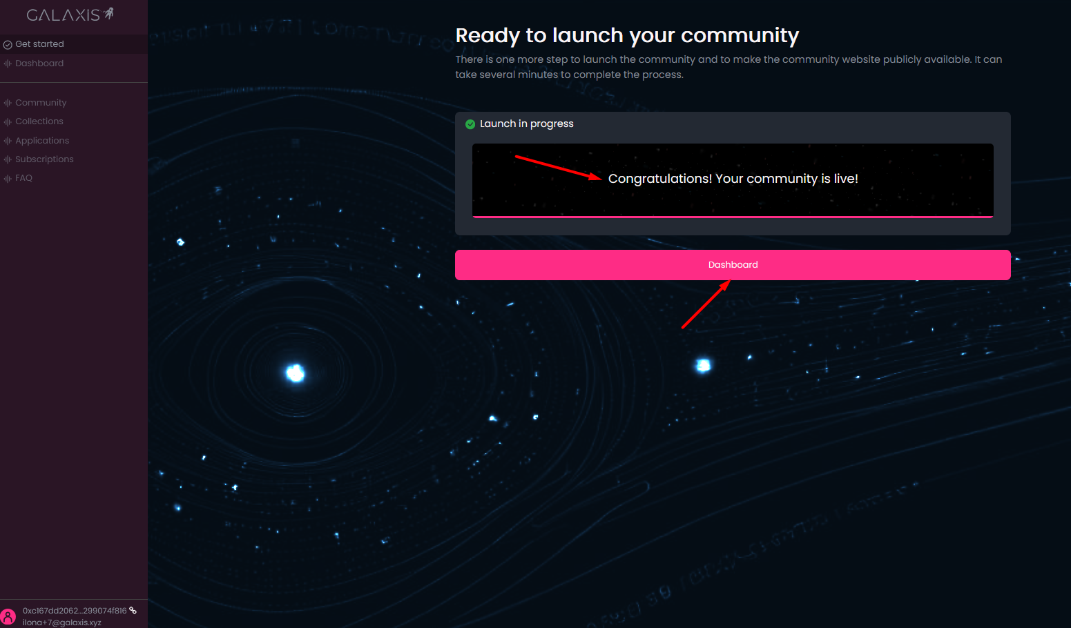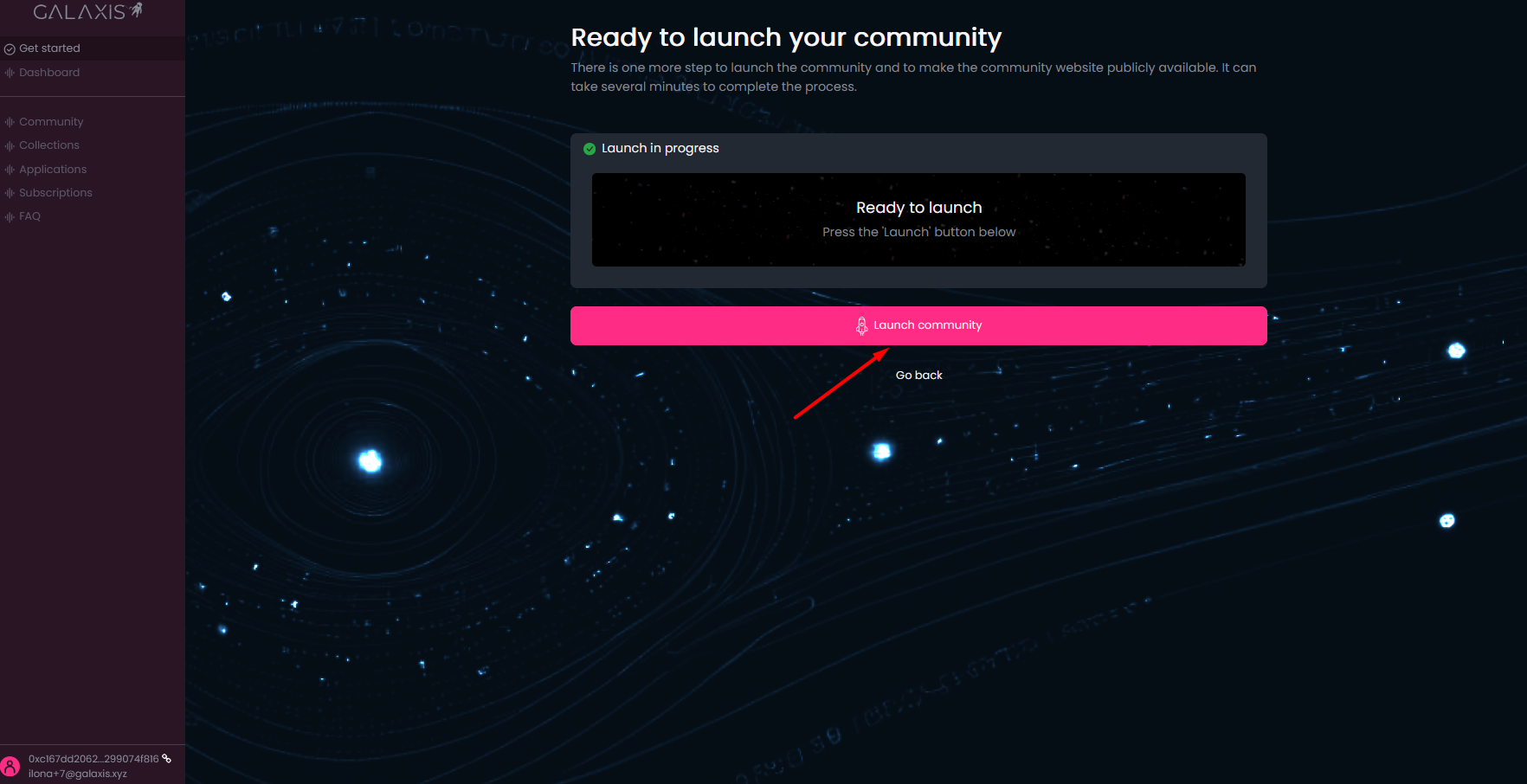 The community website will be created and the appropriate data will be written on blockchain - when the contracts are deployed, you will have to confirm a transaction once again in your wallet.
