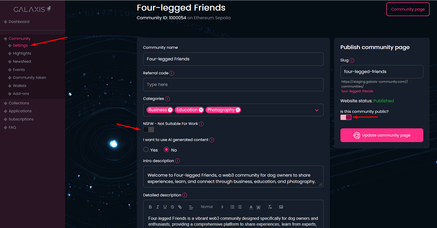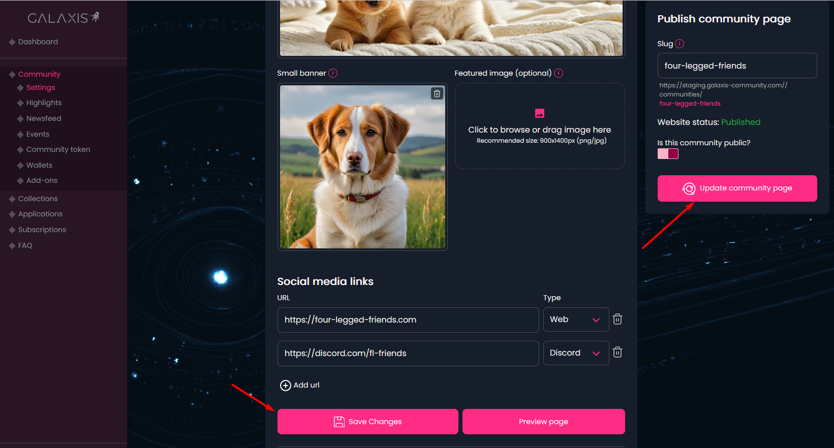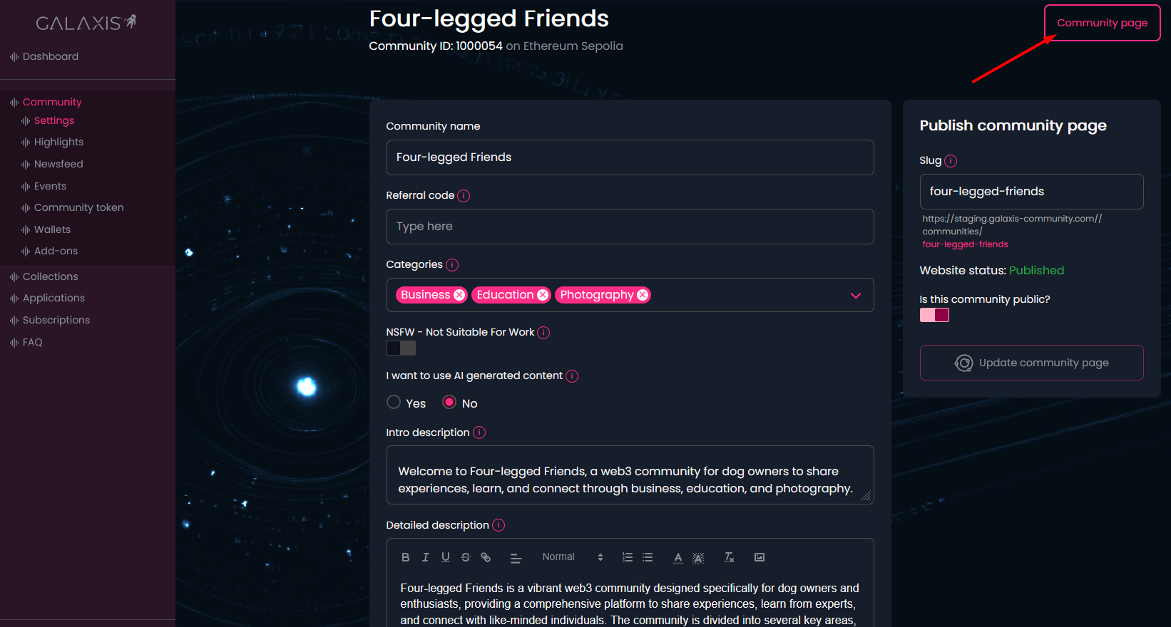 On this page, you can freely edit the details of your community. However, do not forget to click the Save Changes button at the bottom of the page, and then the Update community page button on the right side, in order for the changes to take effect on the community website.