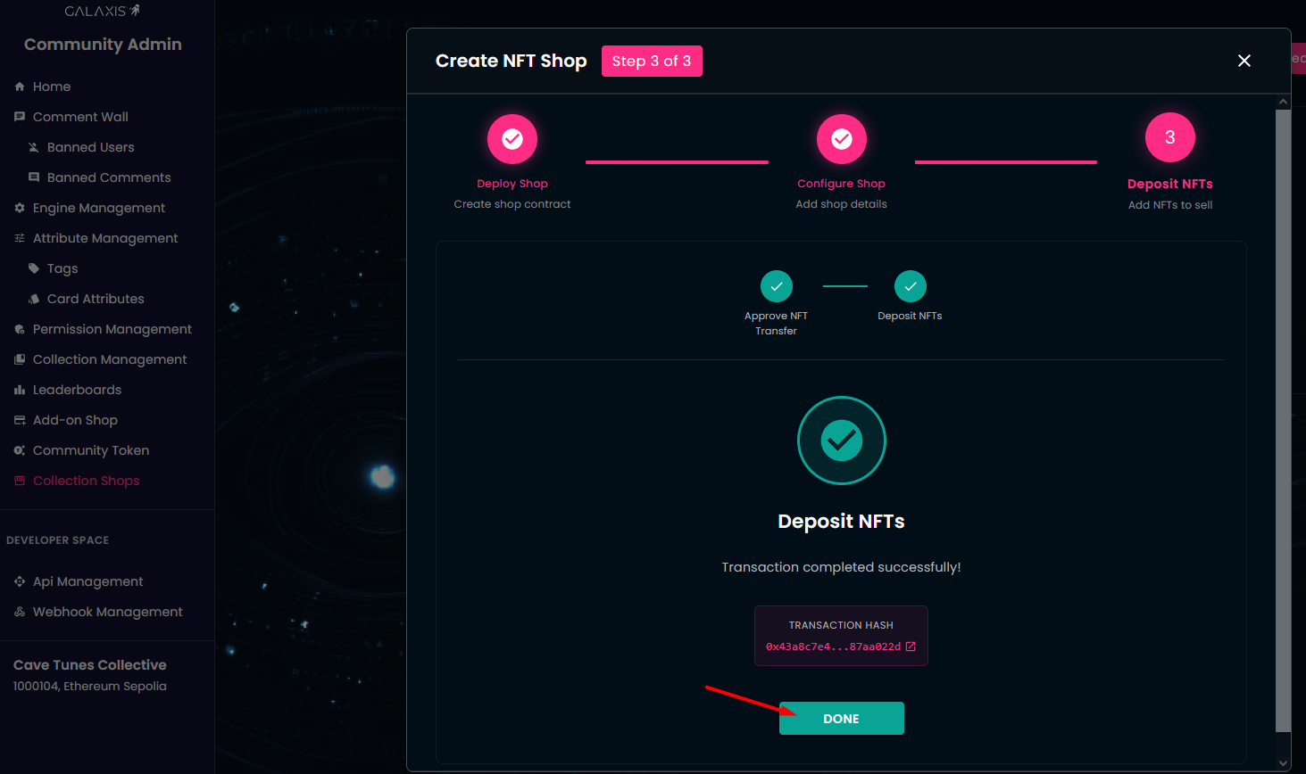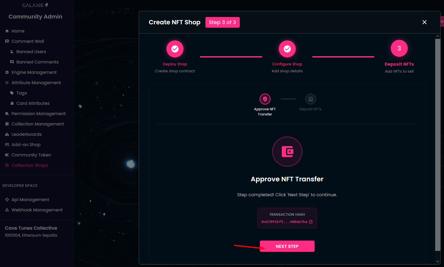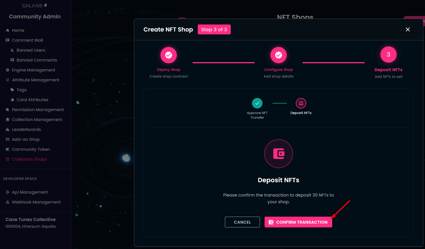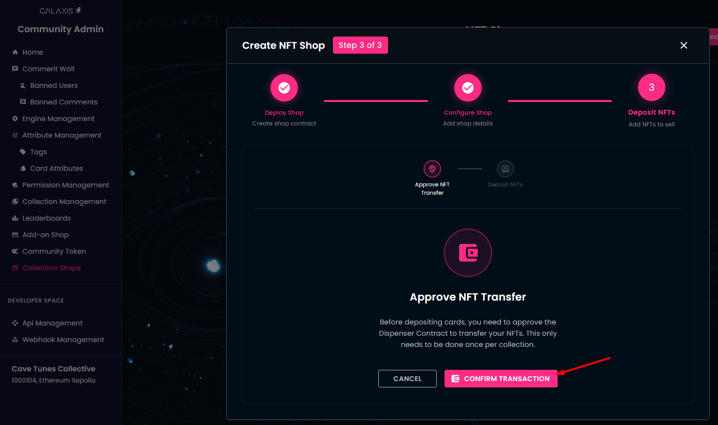 Click the Confirm Transaction button and approve the NFT deposit operation in your wallet.