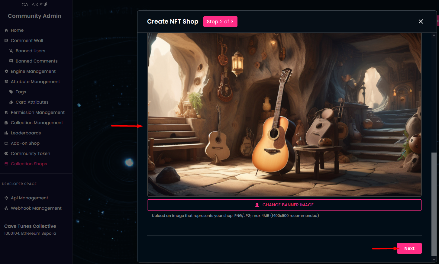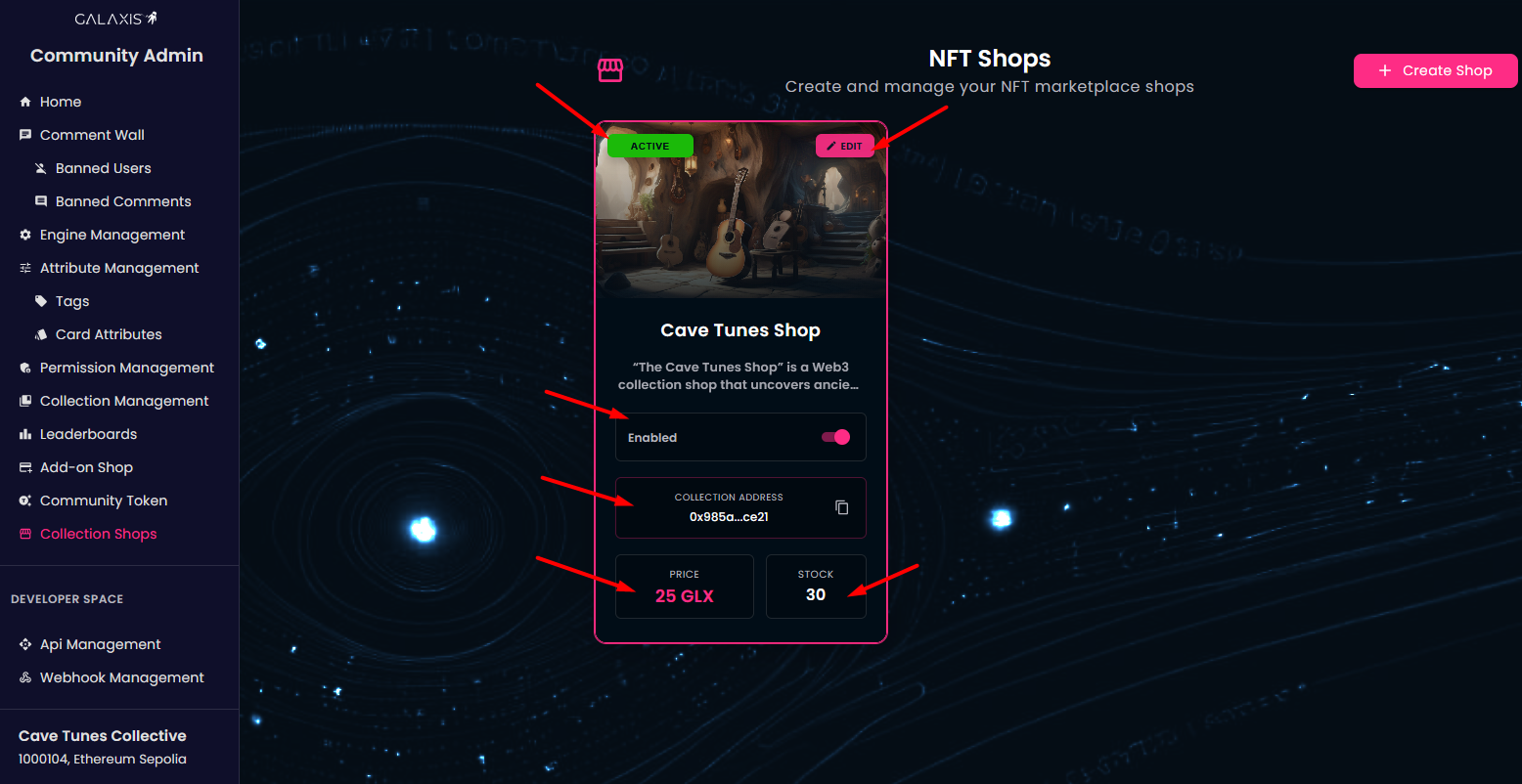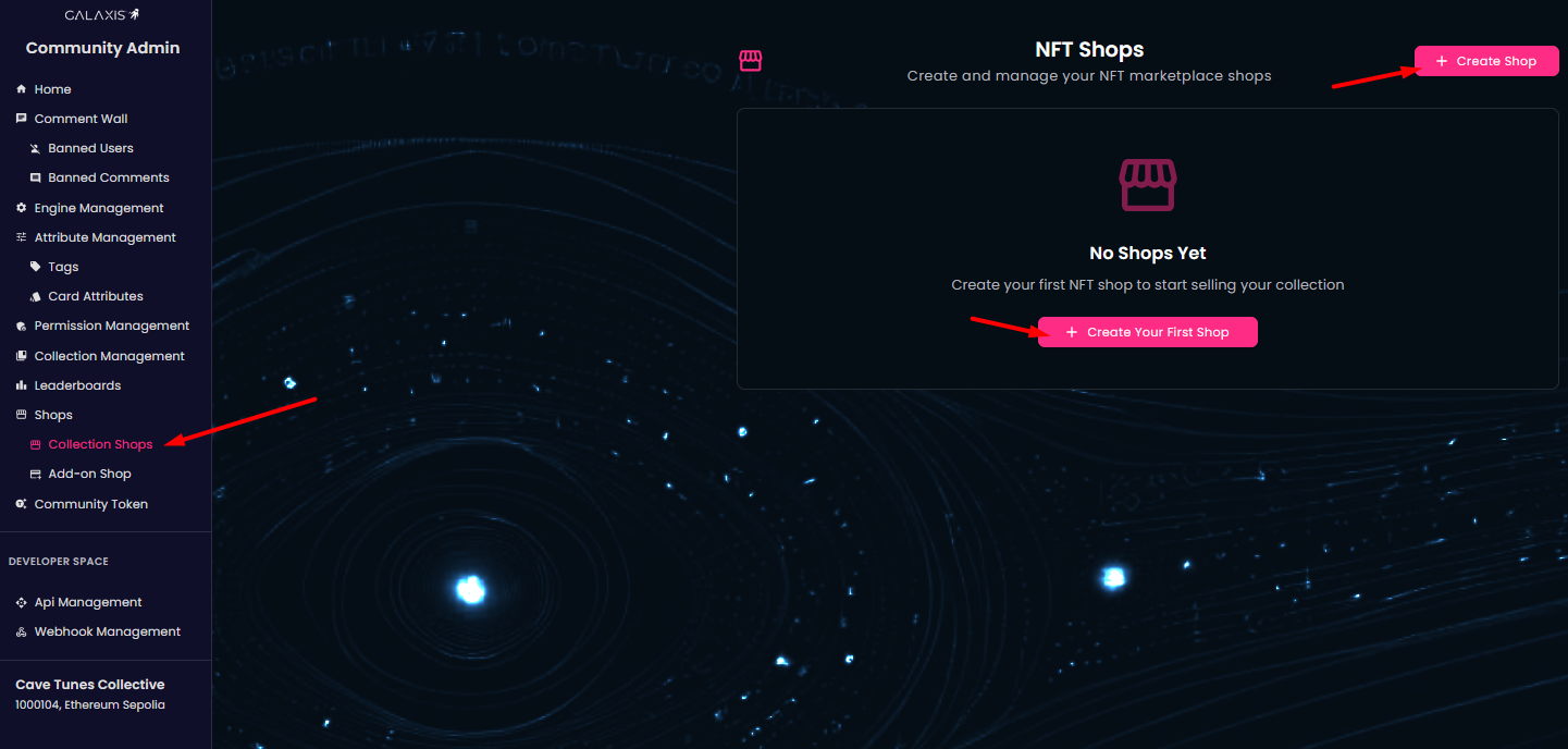 On the Collection Shops page, you have two buttons Create Your First Shop or simply Create Shop. You can click any of it to begin creating your ERC721 shop.