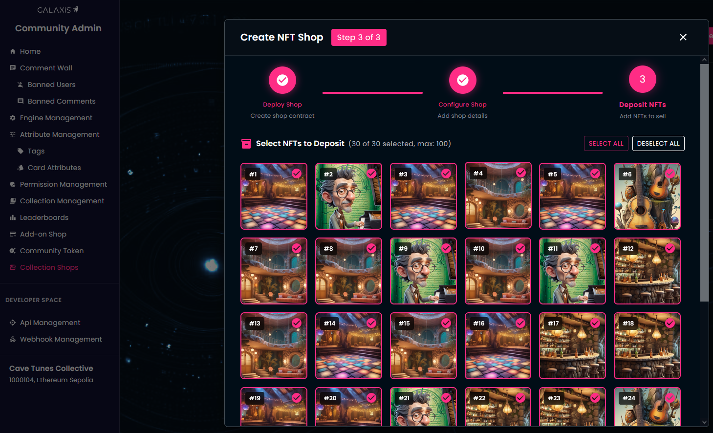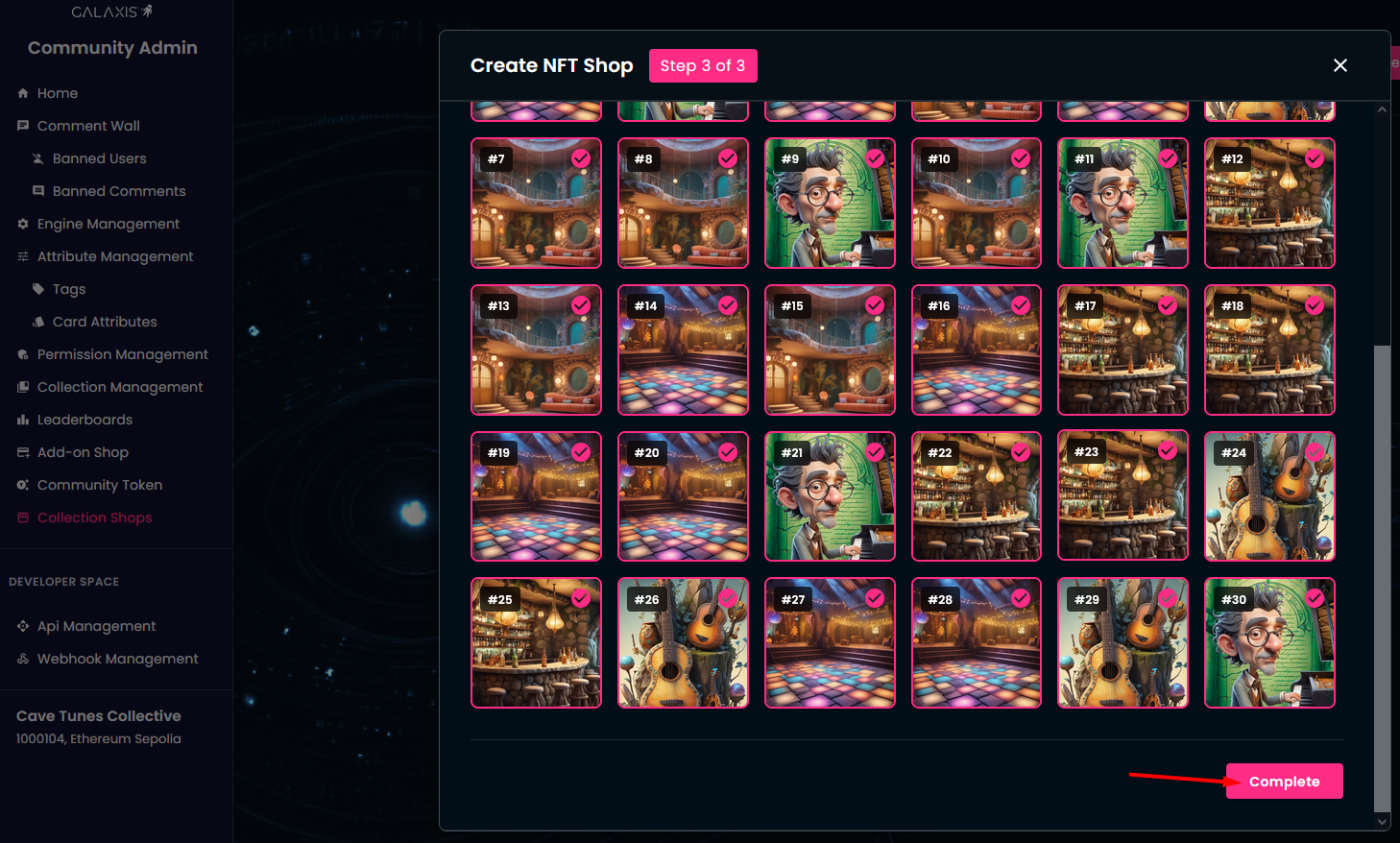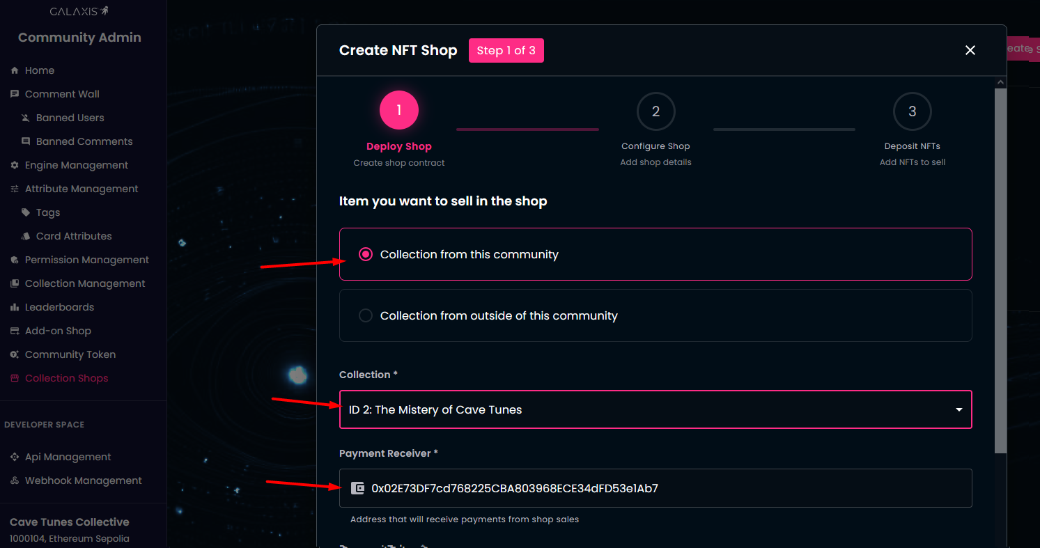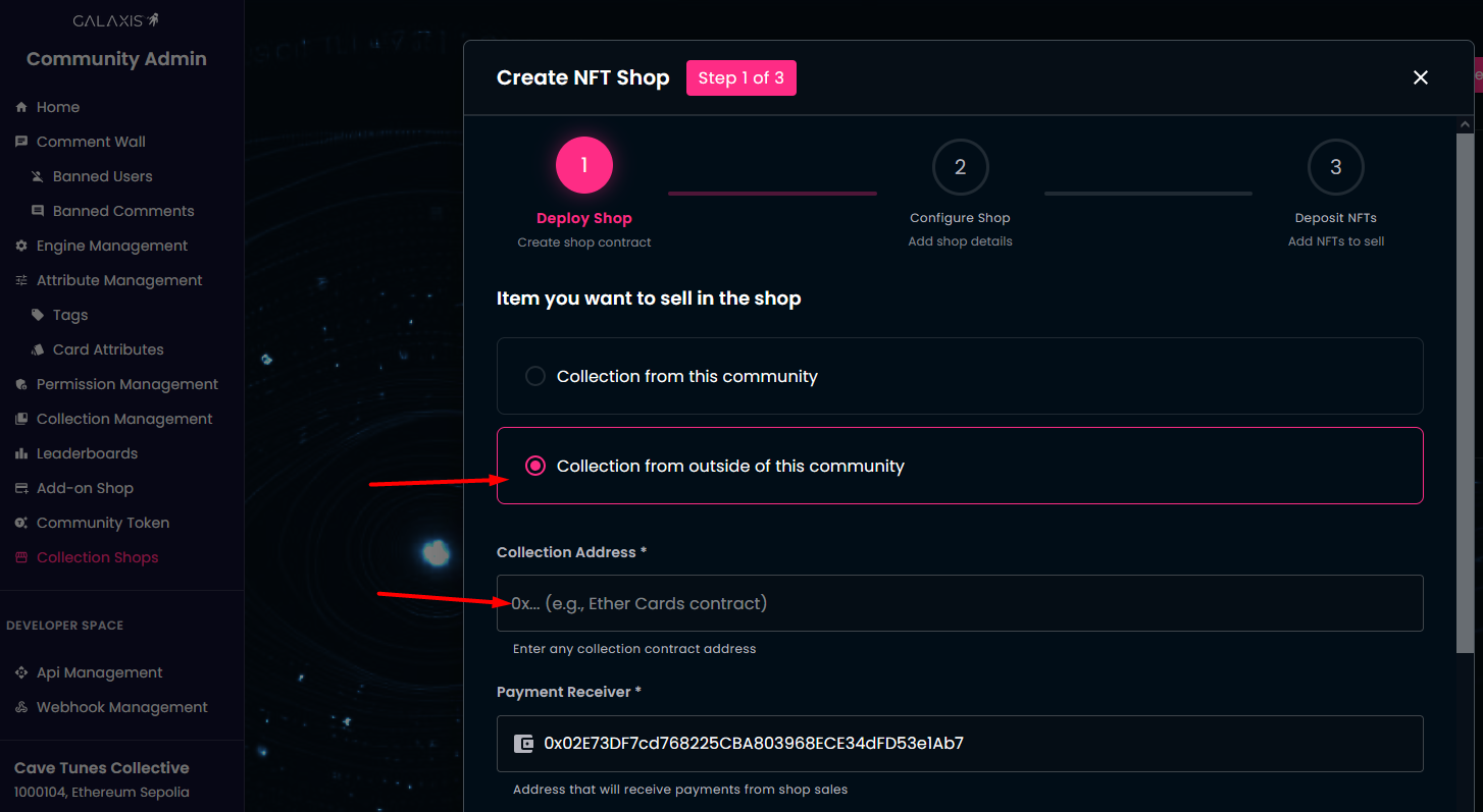 Select the collection of whose items you want to sell. This can be an additional collection from the actual community, or it can be an external collection.