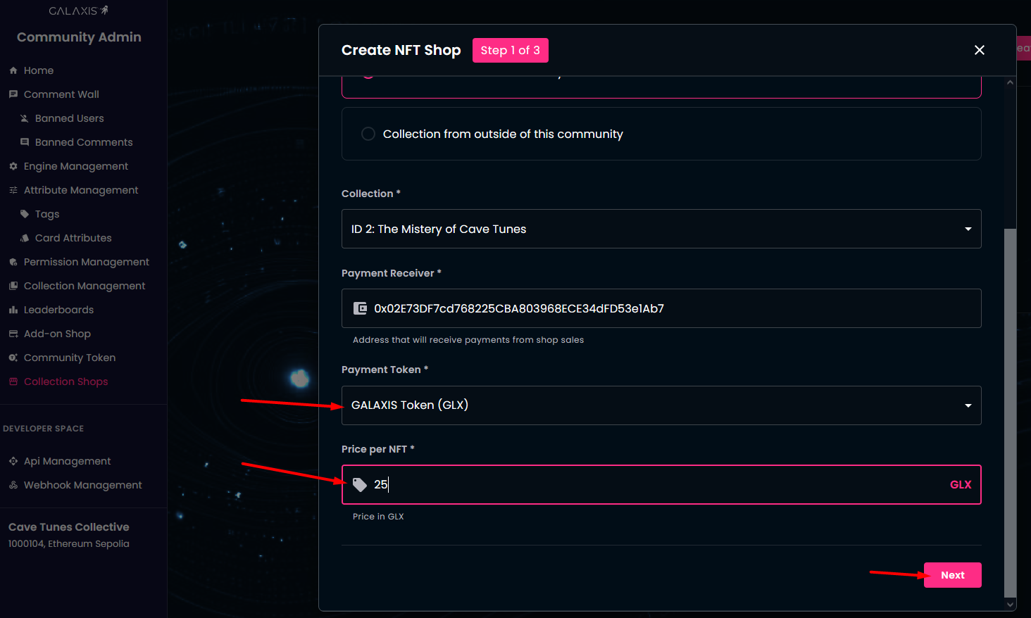 Select the Payment Token from the dropdown. This can be GALAXIS or USD.