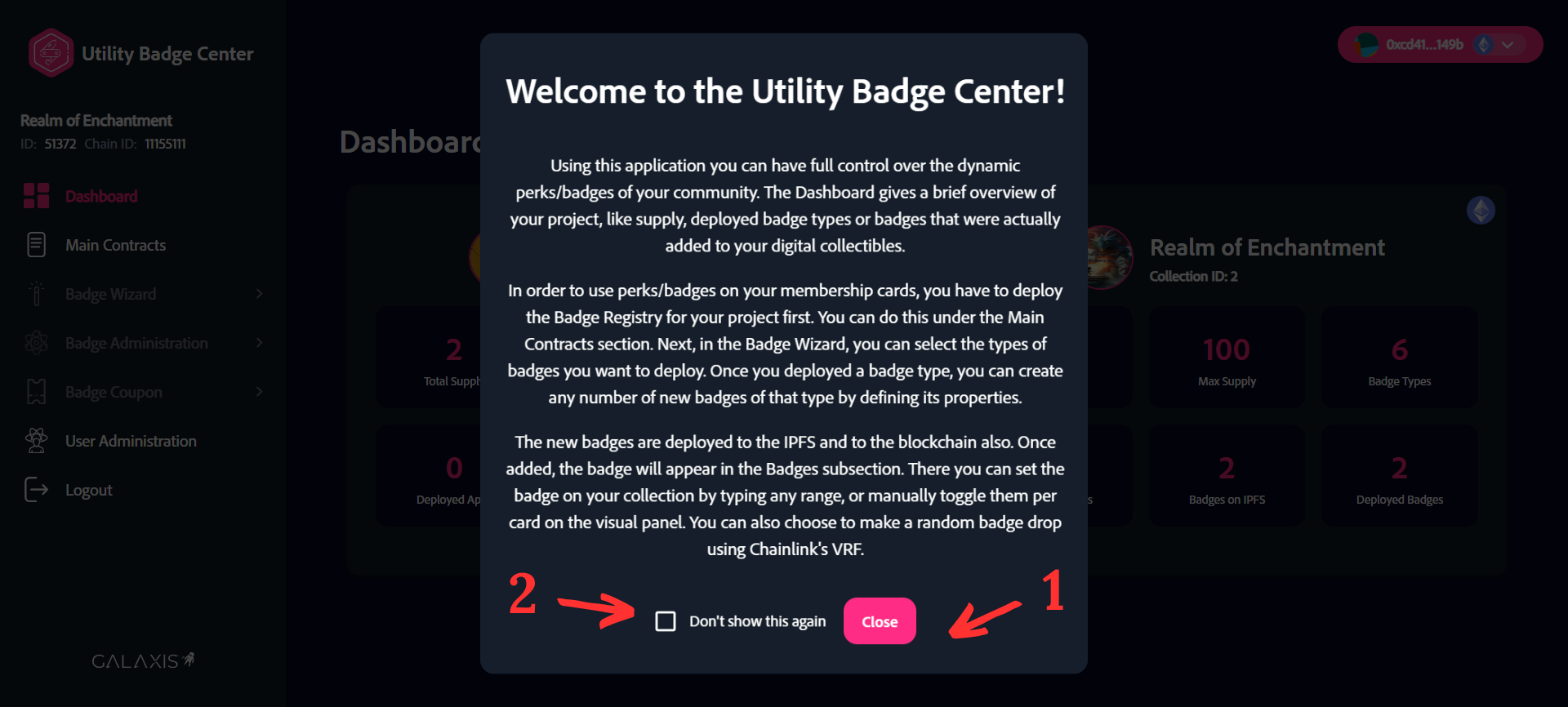 On the top left corner, below the Utility Badge Center text you can see the name of your community to which the UBC belongs. Below the community name, there is the community ID and the Chain ID. On the right side you can see your collections and the information belonging to them.