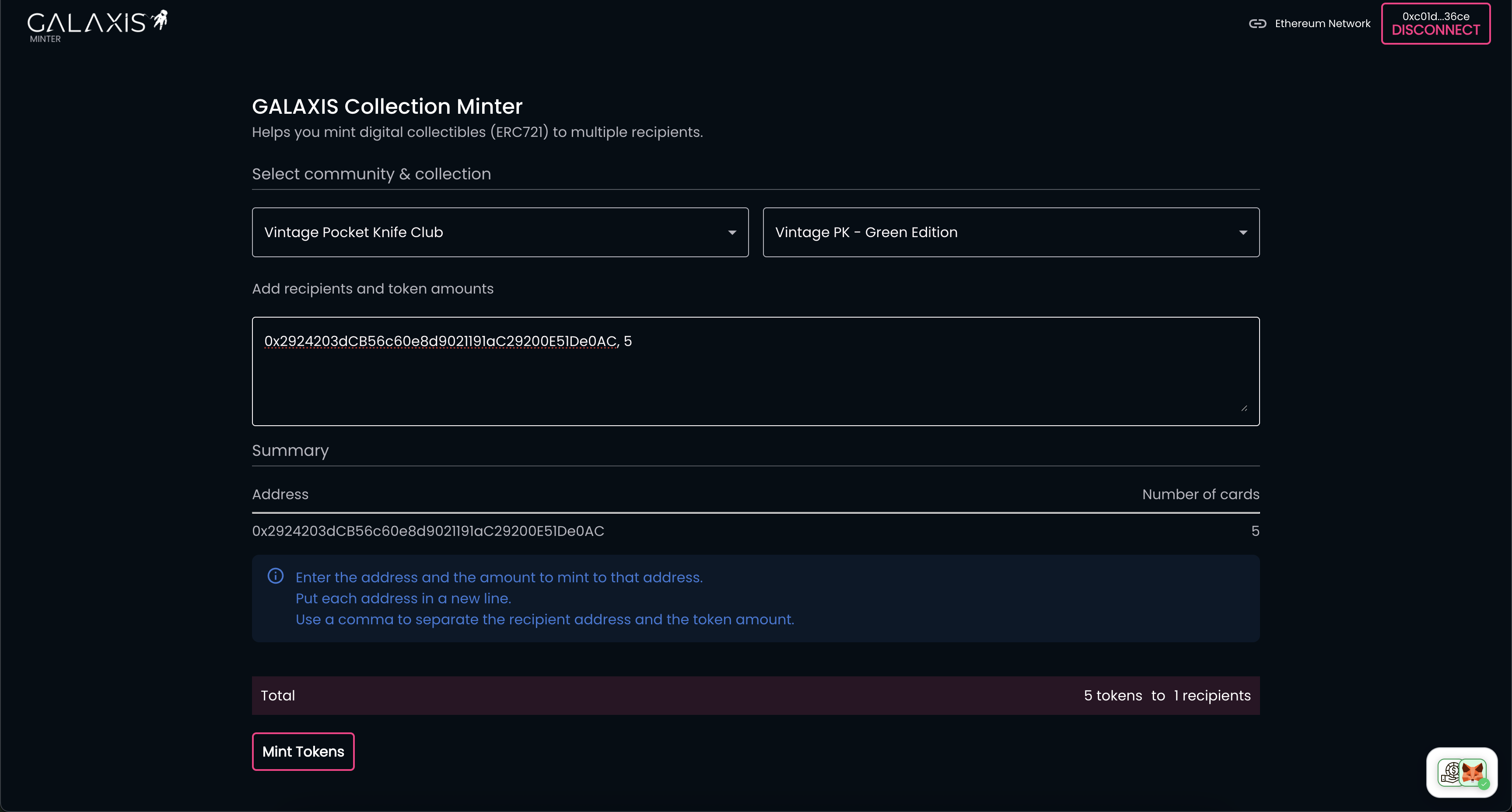 It can be used by community owners, members, or Galaxis fans - as long as the ERC721 tokens intended for distribution are held in their wallet.