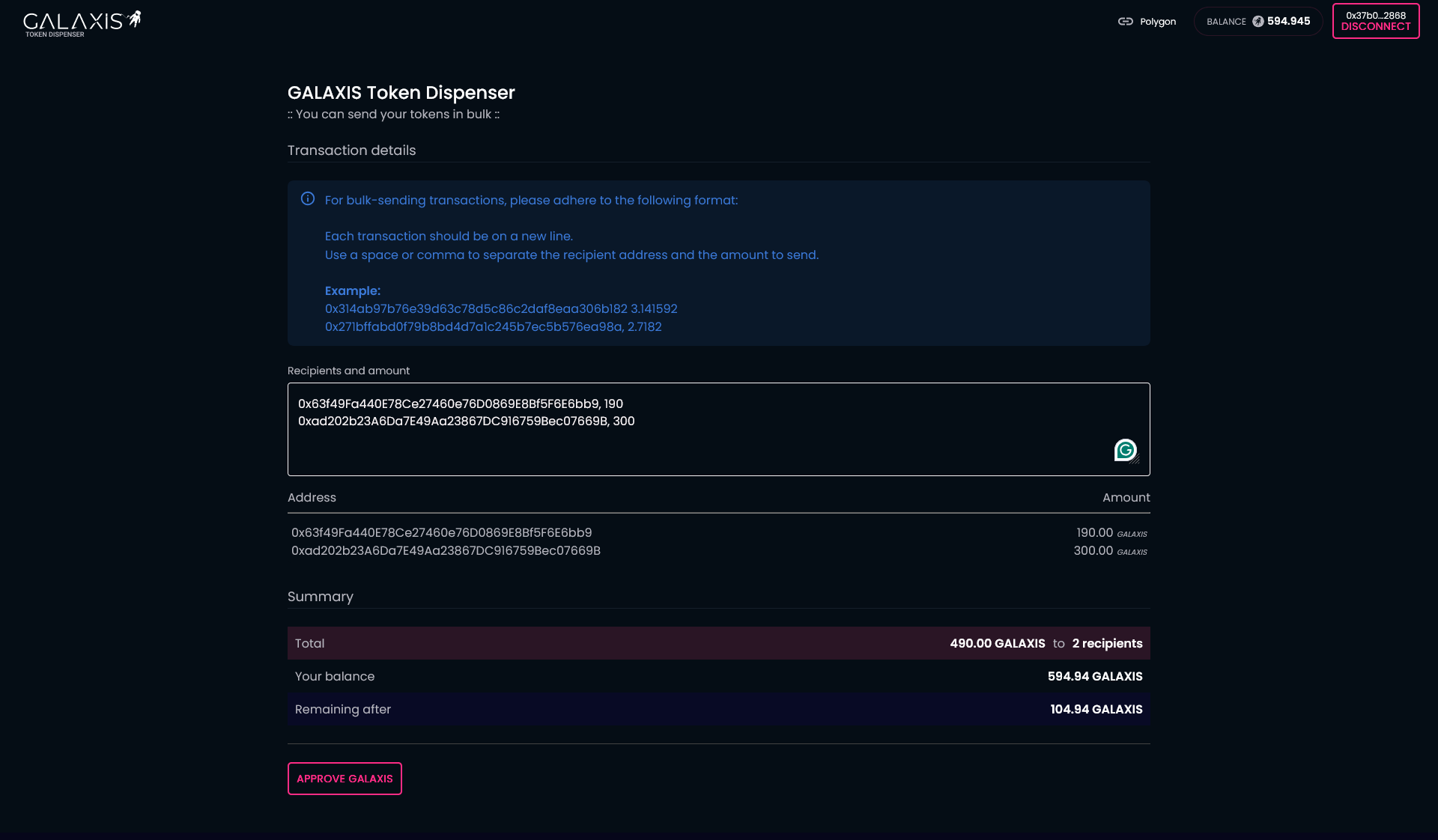 If you own GALAXIS Tokens that you wish to send as a reward or make a gift, you can accomplish these with the help of this tool regardless of being a community owner, community member or just a Galaxis fan.
