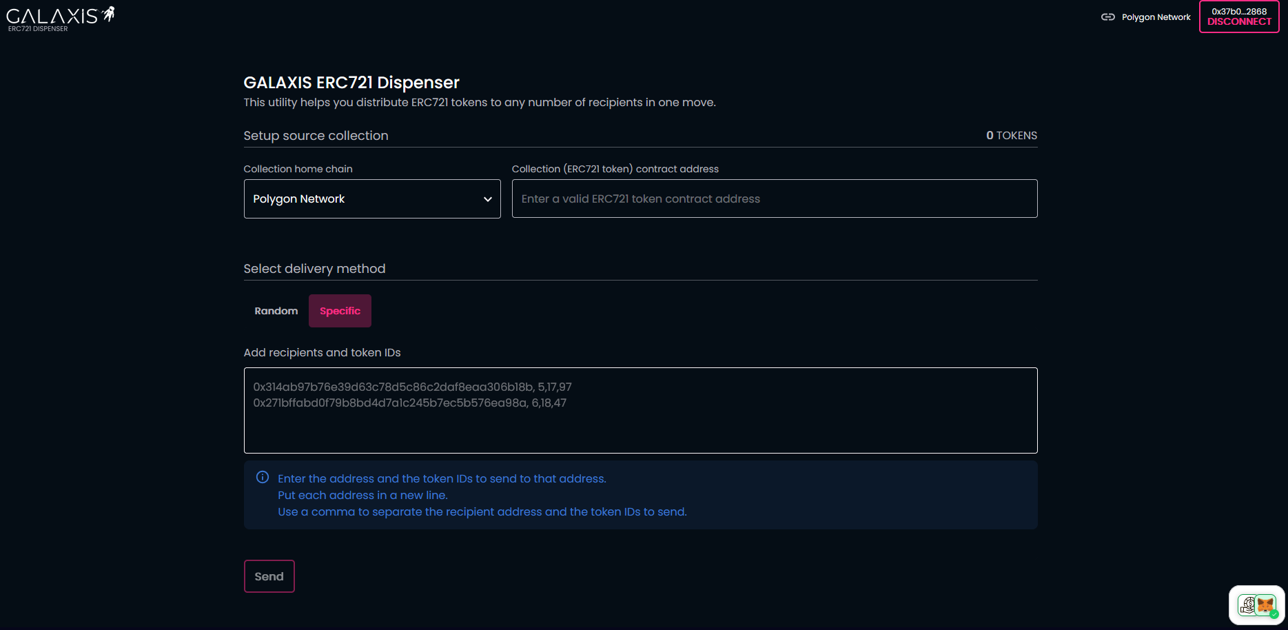 This tool is very similar to the Galaxis Token Dispenser app, except that instead of GALAXIS Tokens you can distribute ERC721 type tokens, and it provides an extra feature - the possibility of sending specific tokens or random ones based on your choice.