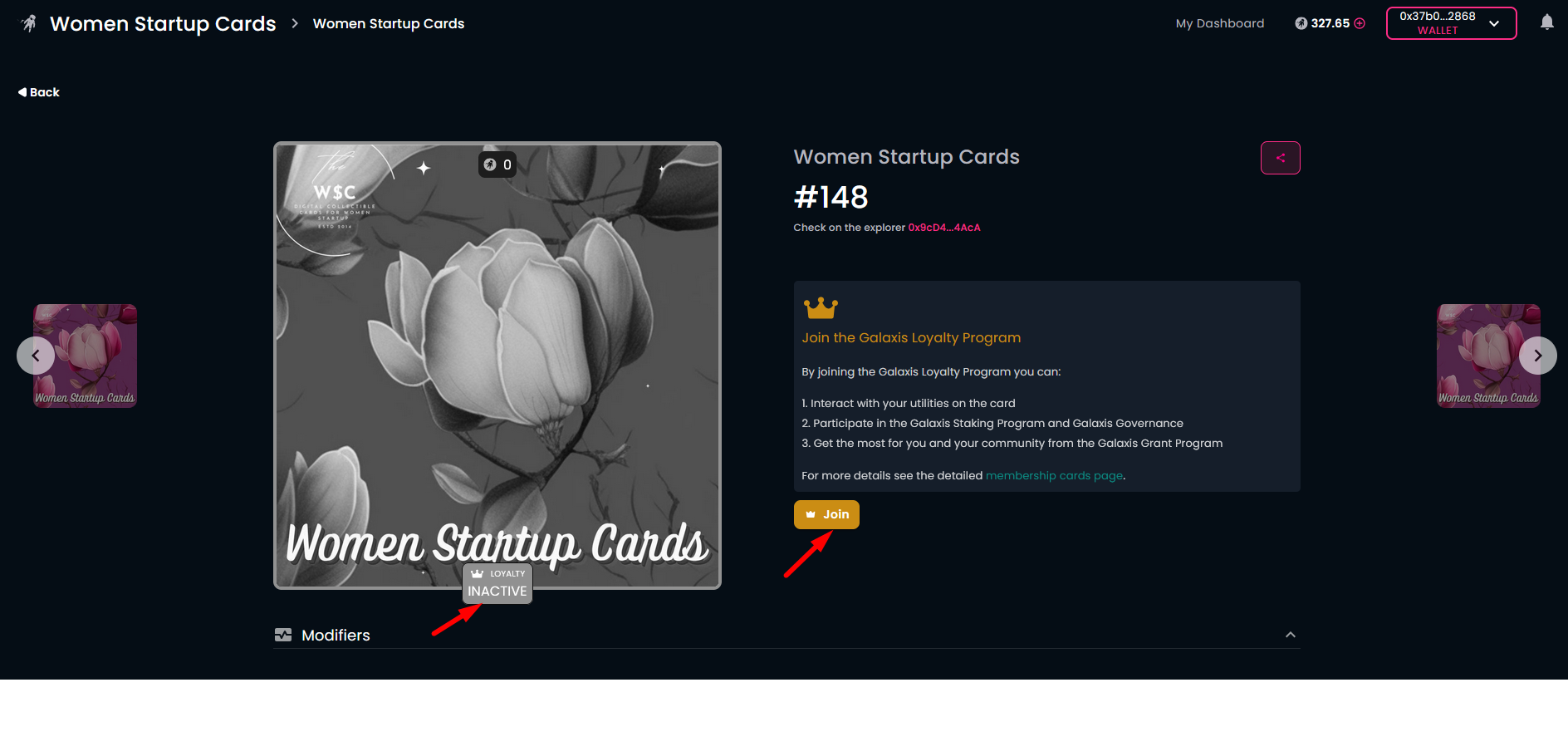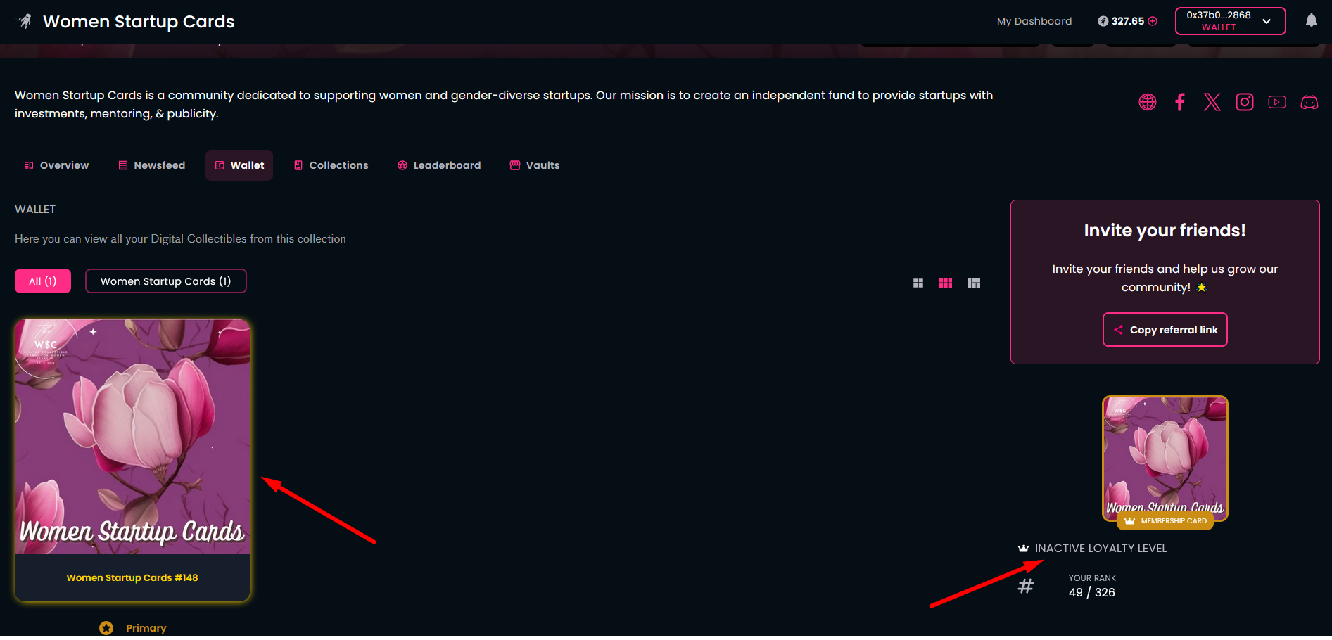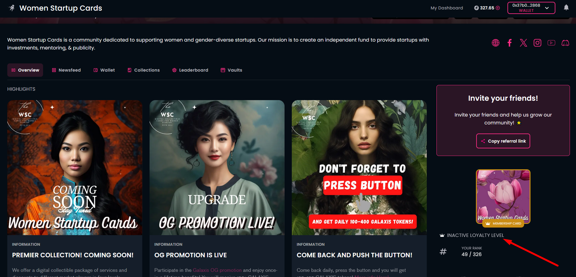 Open the community homepage and connect your wallet. The homepage will show your membership card, obtained earlier. You can also see the "INACTIVE LOYALTY LEVEL" subtitle below the membership card.