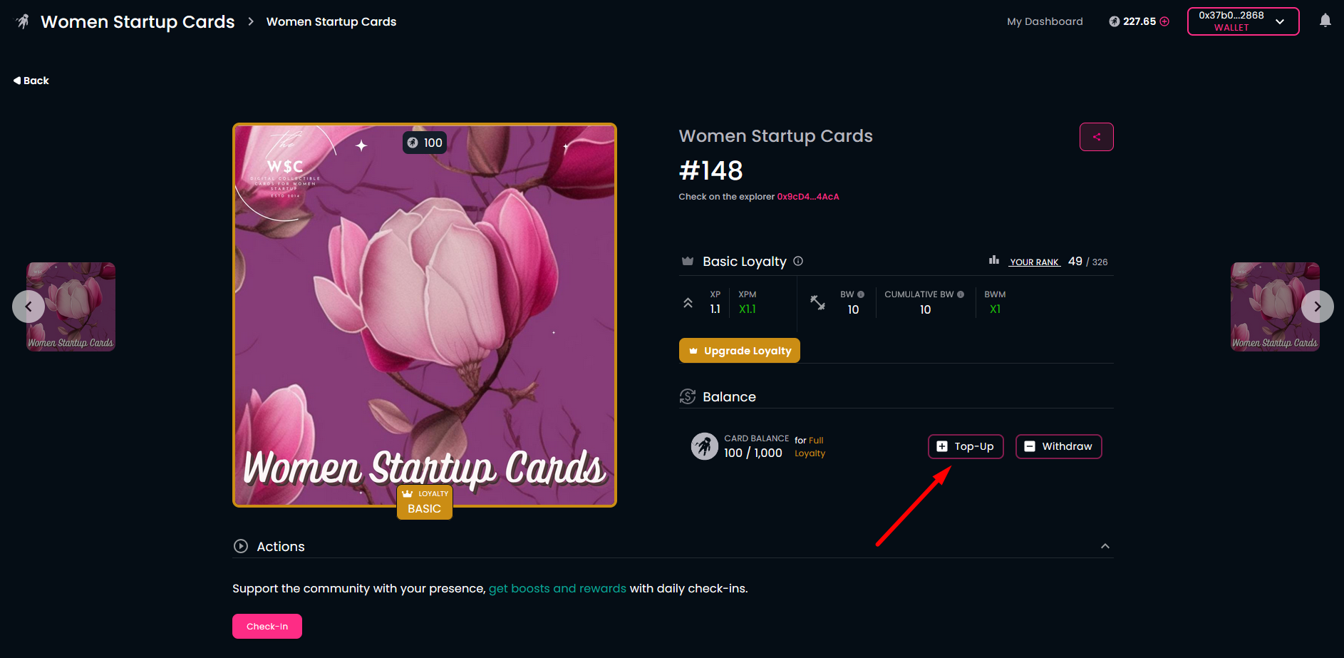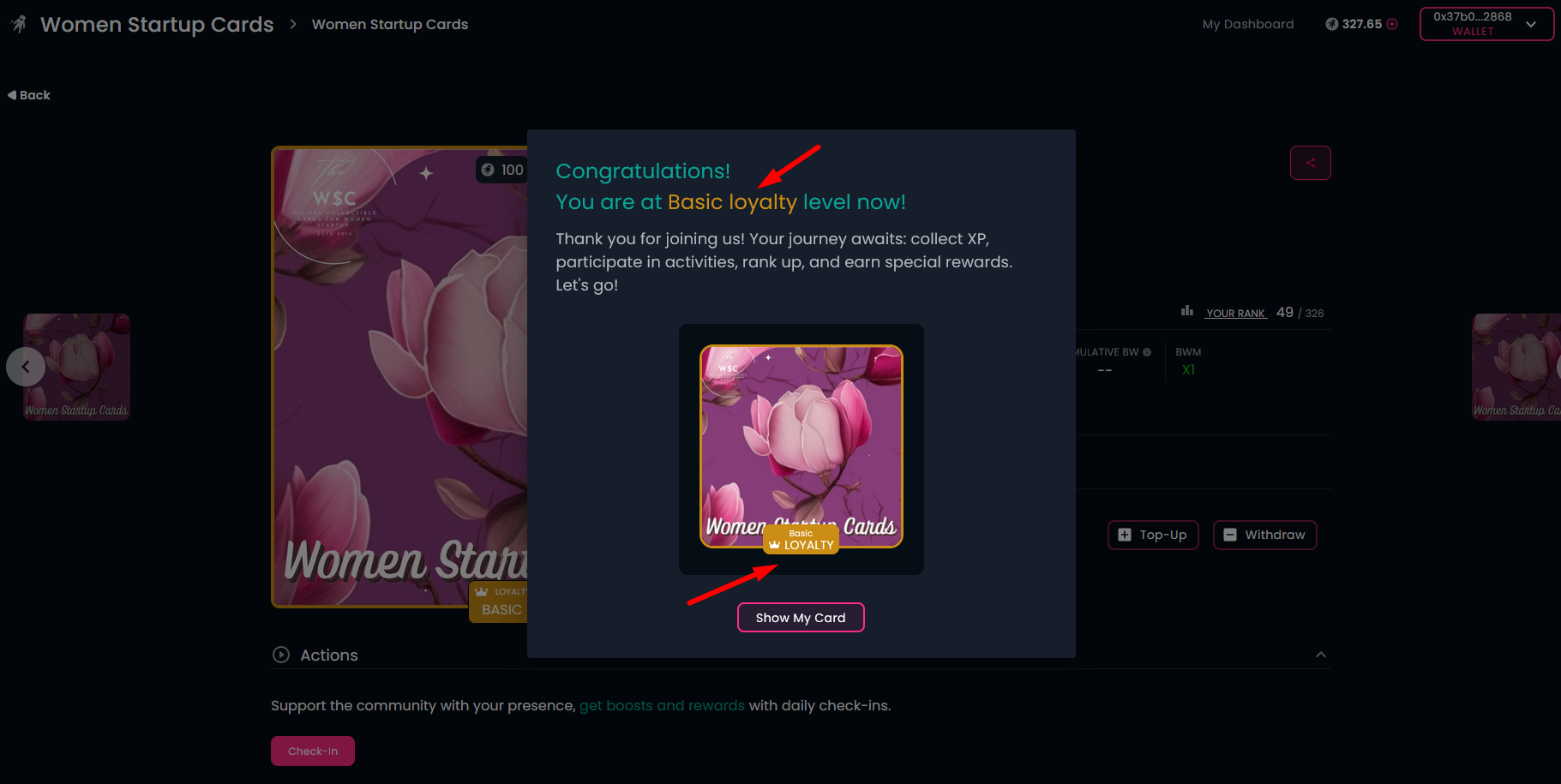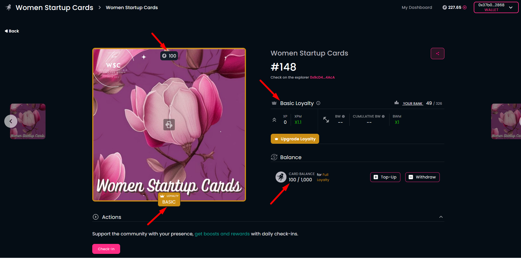 Open the community homepage and connect your wallet. The homepage will show your membership card, obtained earlier. You can also see the "INACTIVE LOYALTY LEVEL" subtitle below the membership card.