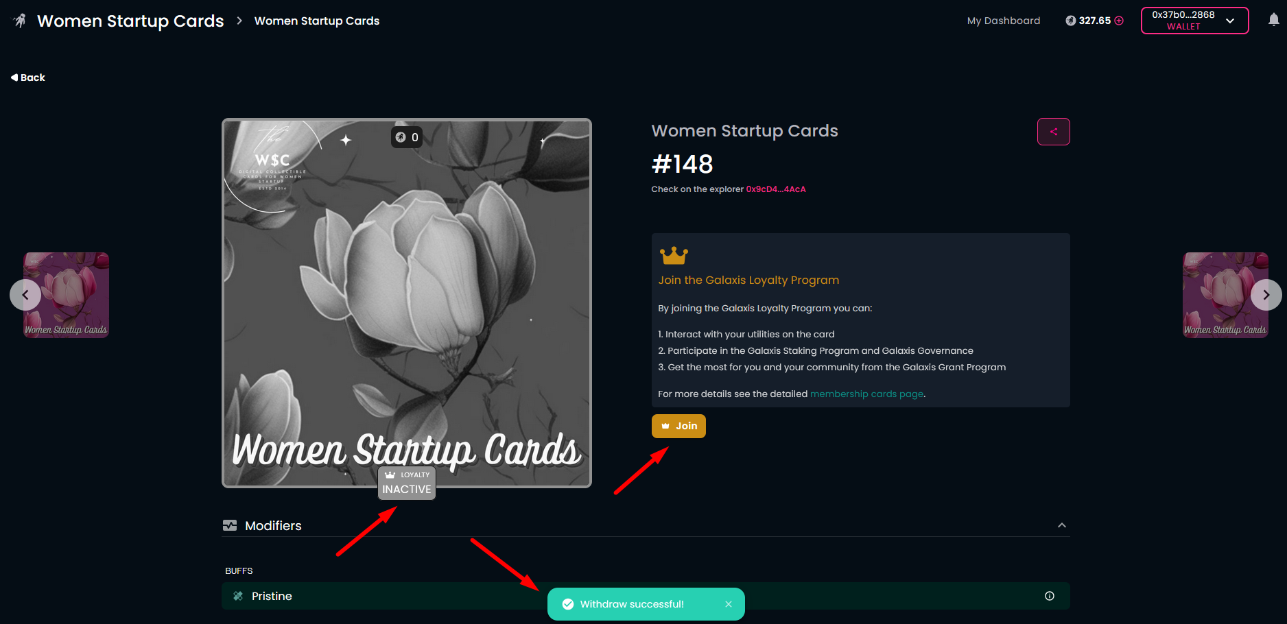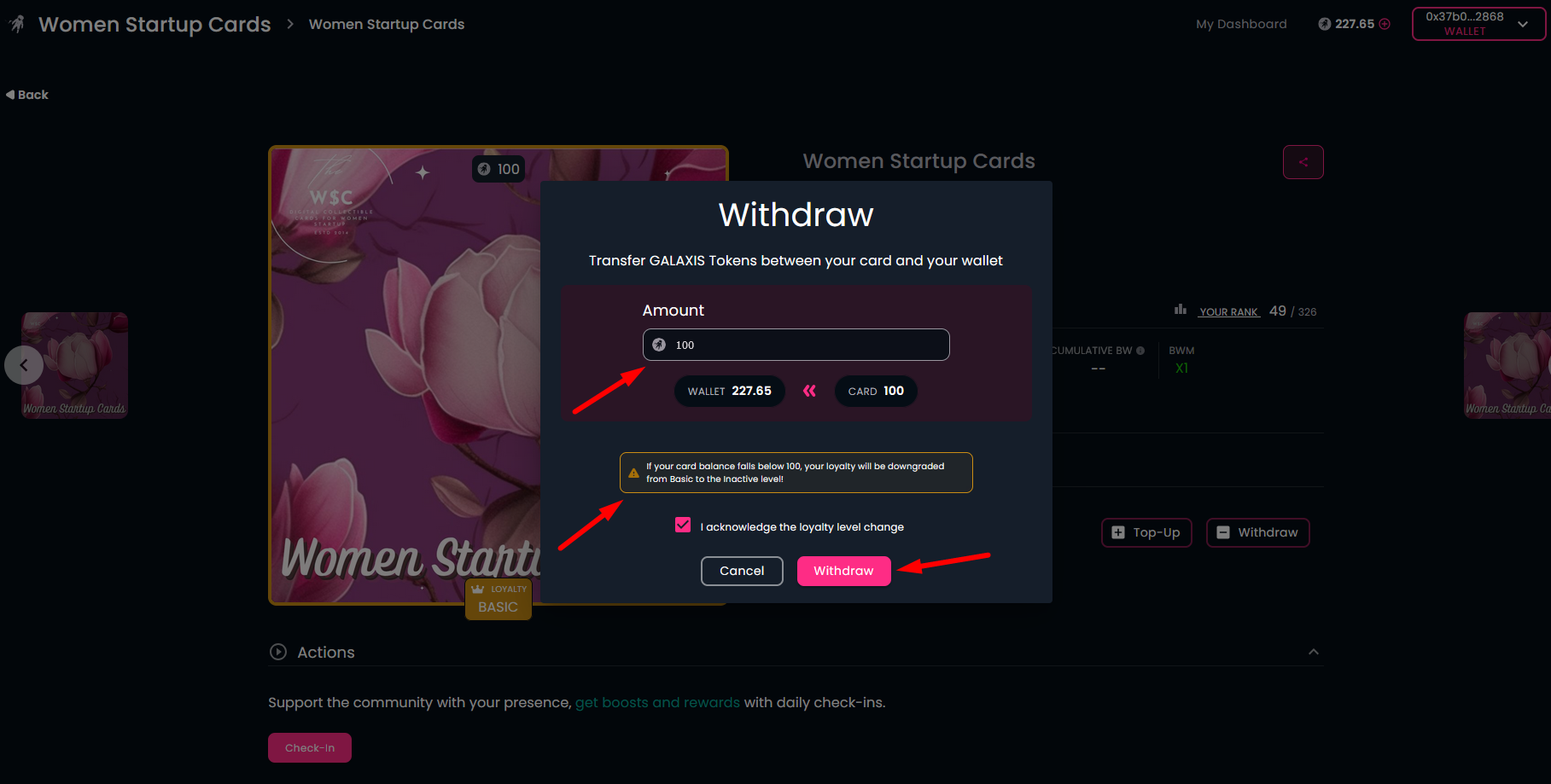 In case you do not want to keep your loyalty level, you can withdraw the deposited GALAXIS Tokens from your membership card.