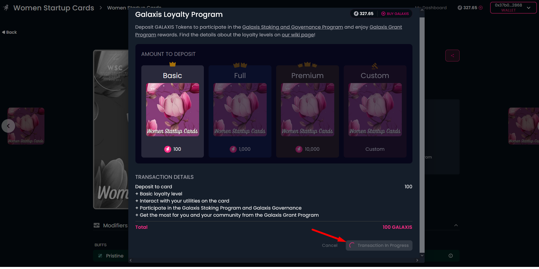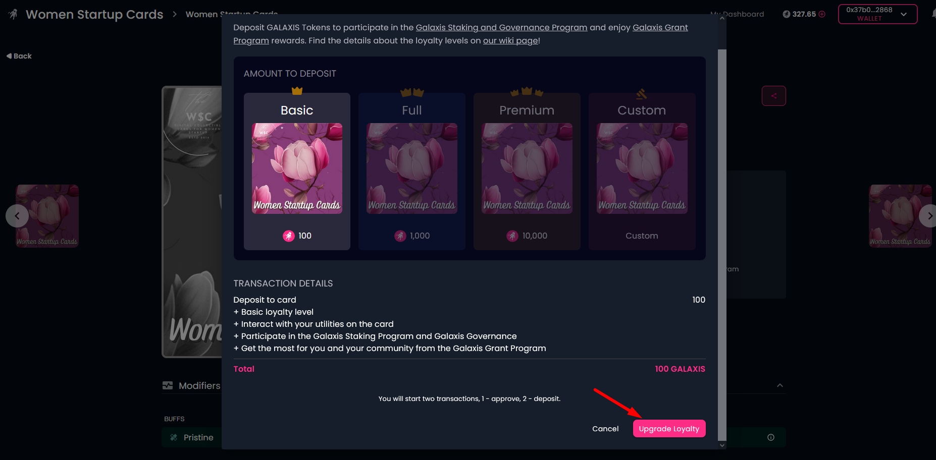 Select the loyalty level you wish to upgrade to (higher levels cost more but provide you with more benefits) and click on the "Upgrade Loyalty"" button. This will start two transactions in your wallet. One to approve the movement of your GALAXIS Tokens and the second for deposit.