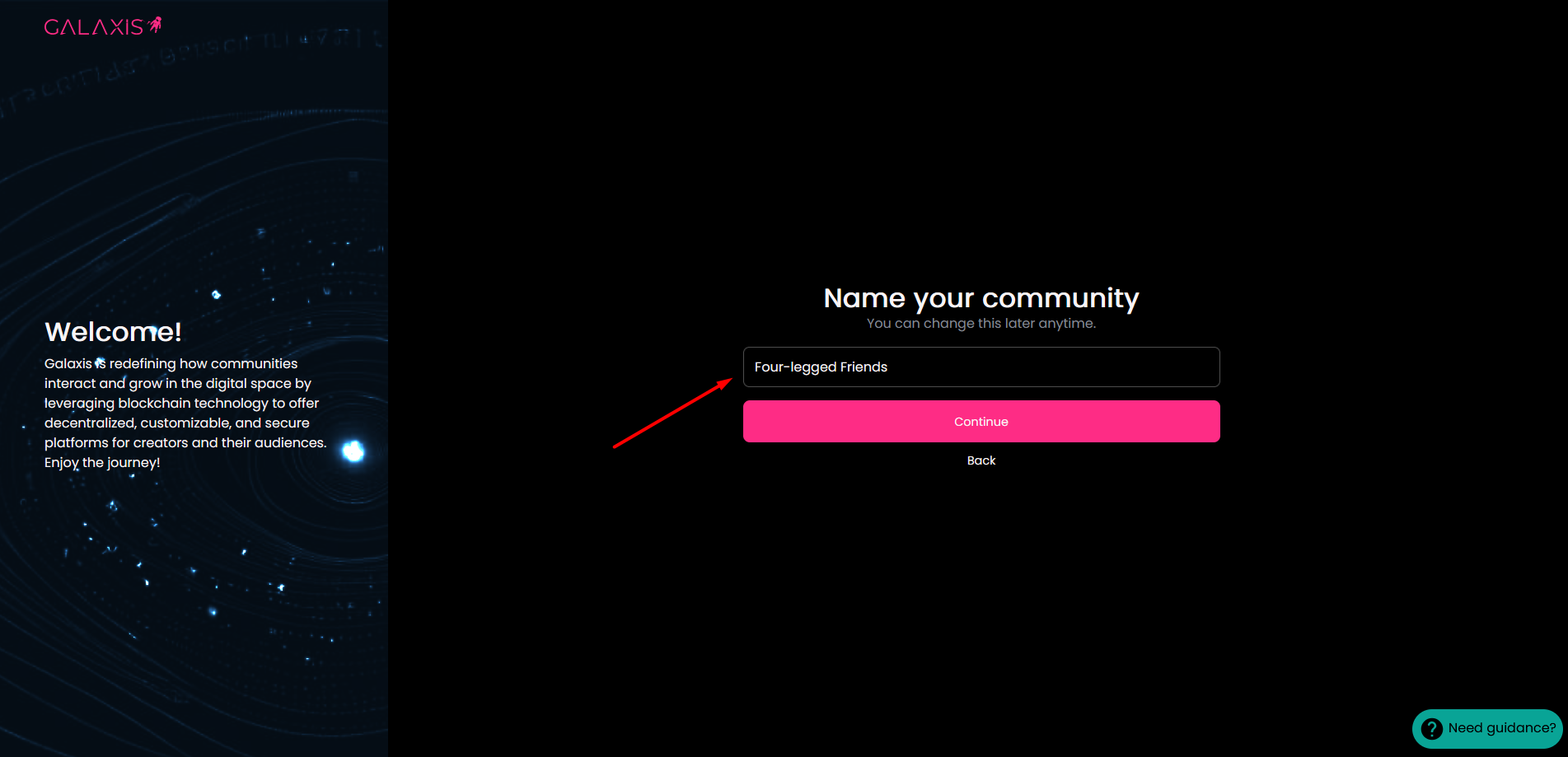 Along with the account creation we begin collecting the basic data necessary to launch your community. The first thing in this process is to provide a name for your community. In general, you can use all kinds of special characters in your community name, even emojis.