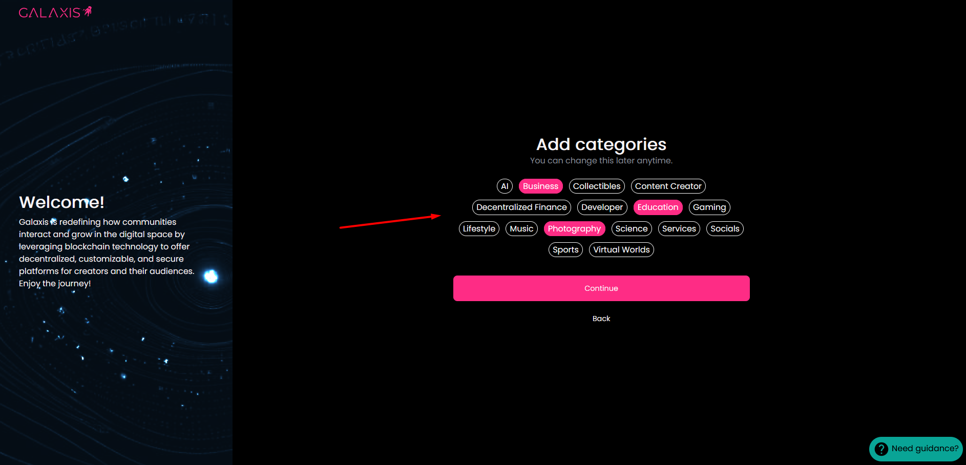 Next, it is recommended to select the categories (maximum 3) that relate to your community. You have the possibility to select the categories later too, but if you set these now, the potential community members can find your community more easily.