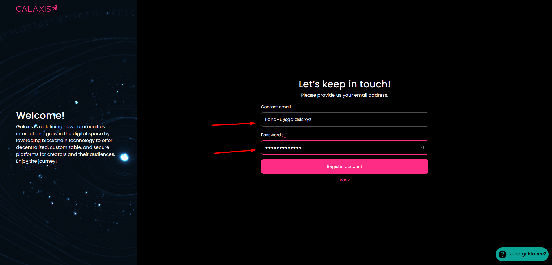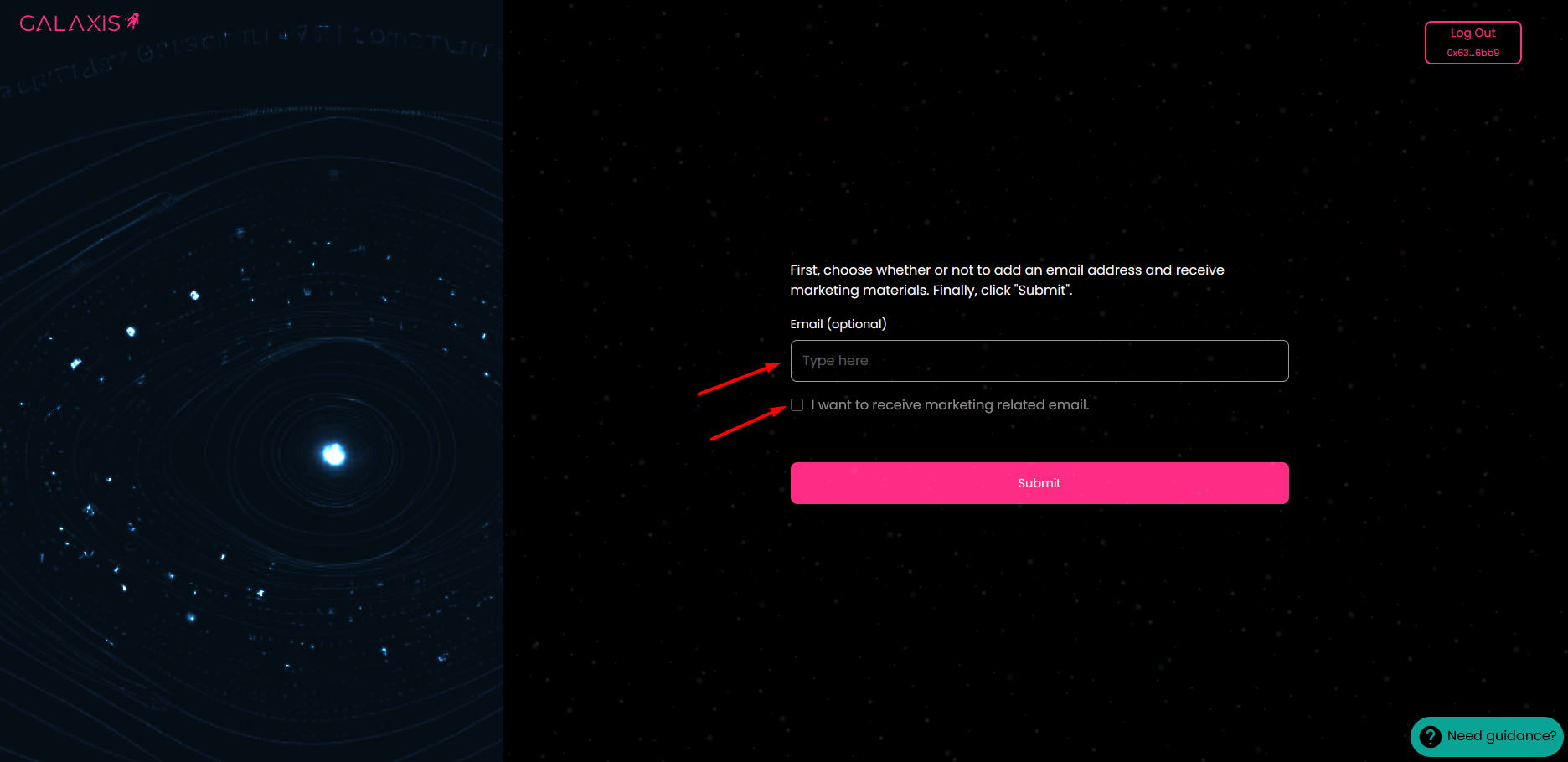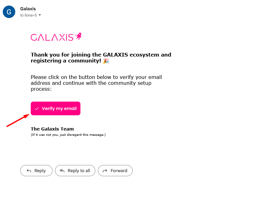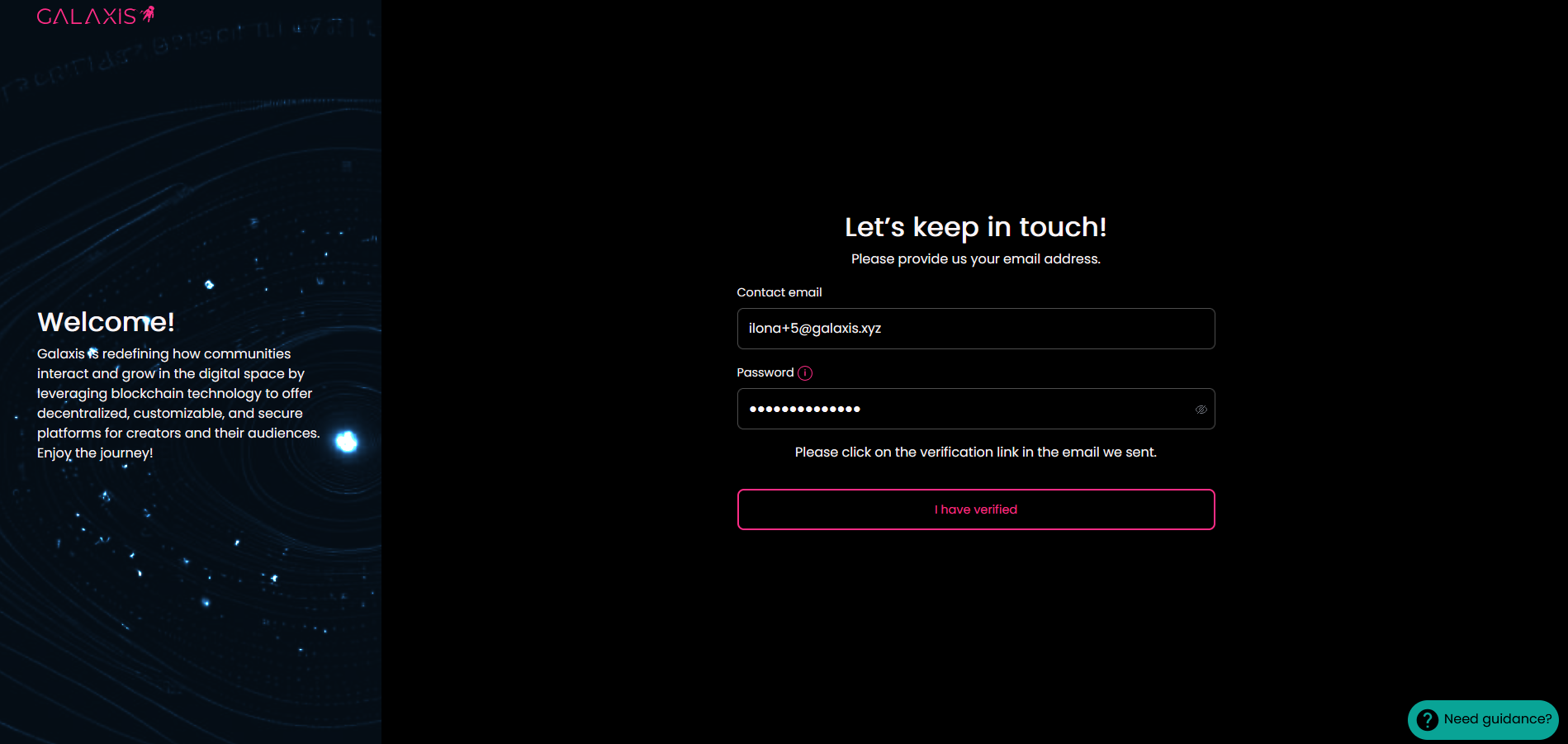 Go to your e-mail account and open the e-mail you have received from Galaxis to verify your e-mail adddress.
