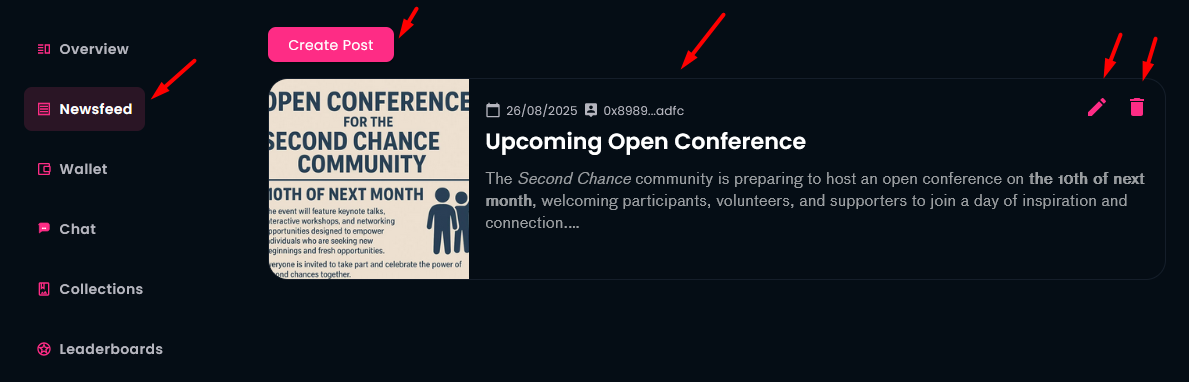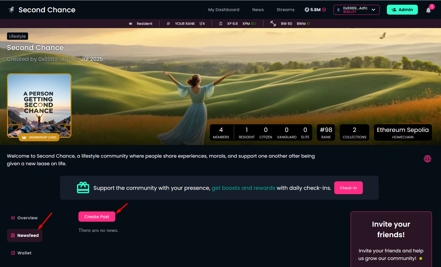 - Connect your wallet that you have used to create your community. After successful connection, open the Newsfeed tab. Here, you will see the Create Post button.
