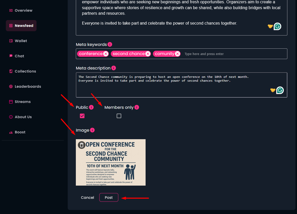 - Decide and mark if the post is public or members only. If you choose to be public, besides the community members, visitors can also read that post.