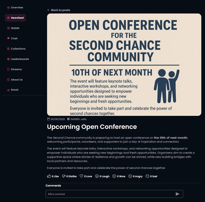 If you click on the news itself, you will be able to see the full post in details. Community members can give reactions and comments to your post.