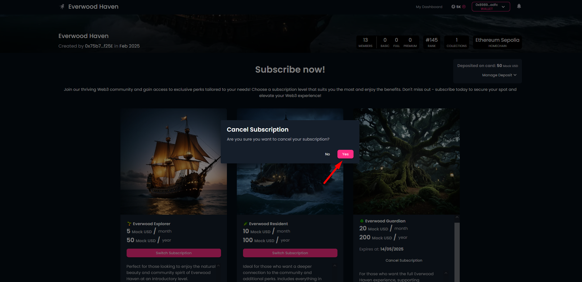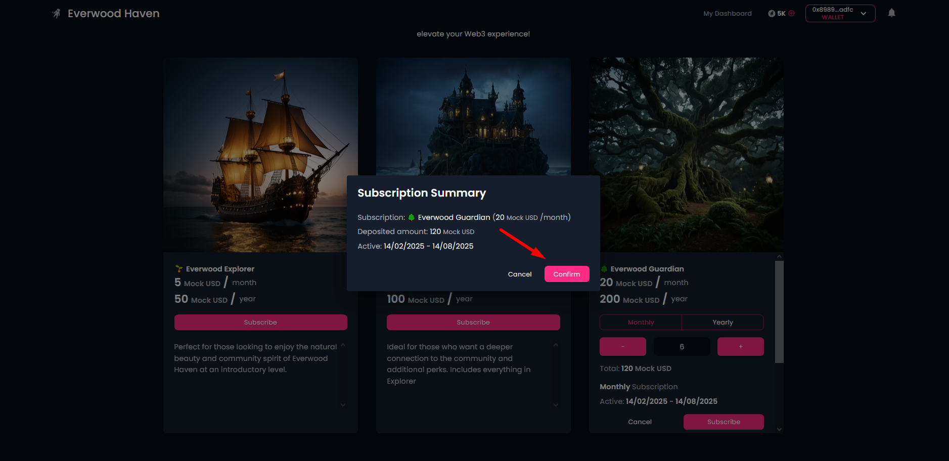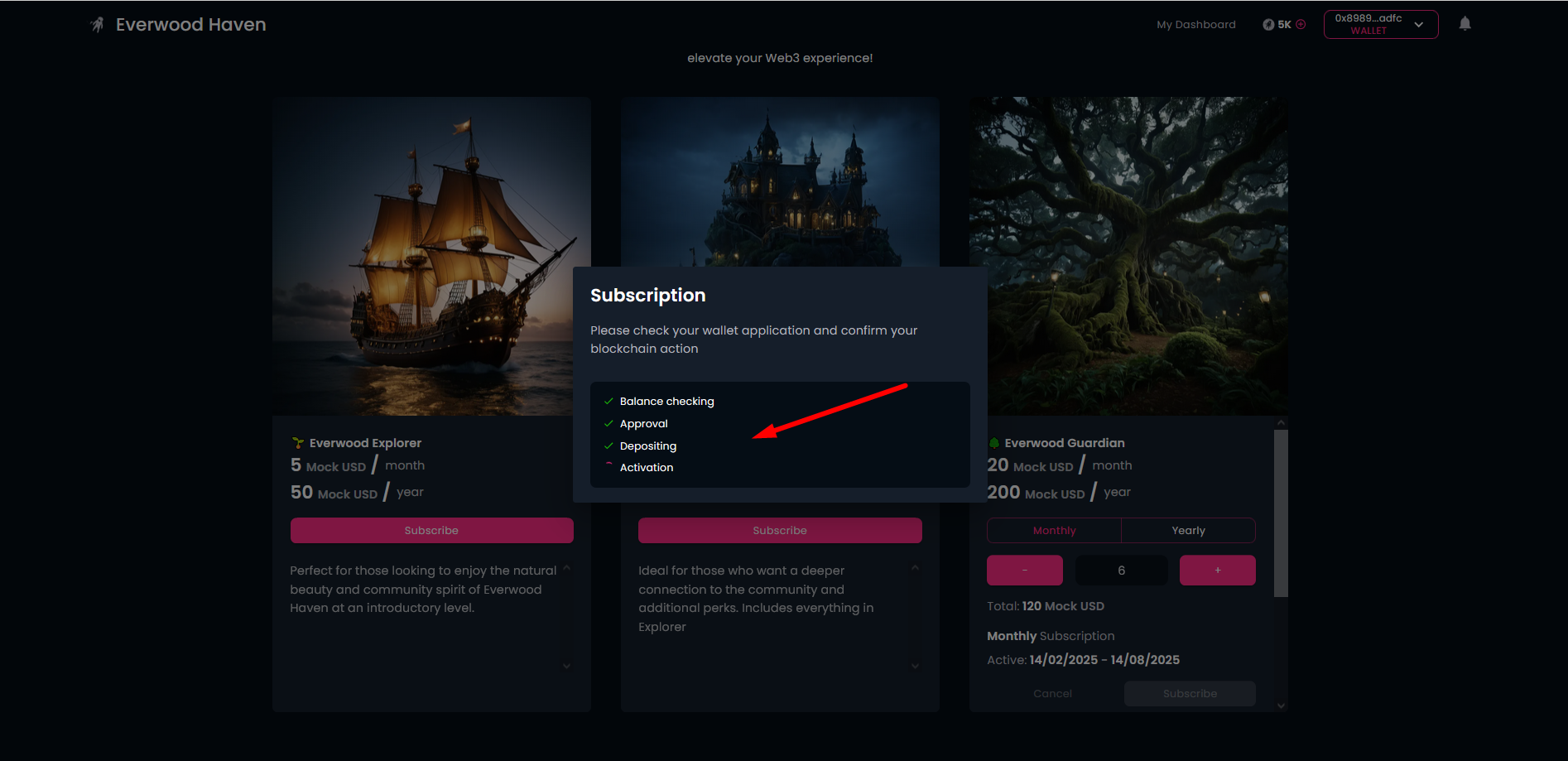 Then, confirm your decision! Here you will have to approve 3 transactions in your wallet, one for Approval, one for Deposit and one for Activation. At the end you will receive the confirmation for your subscription.