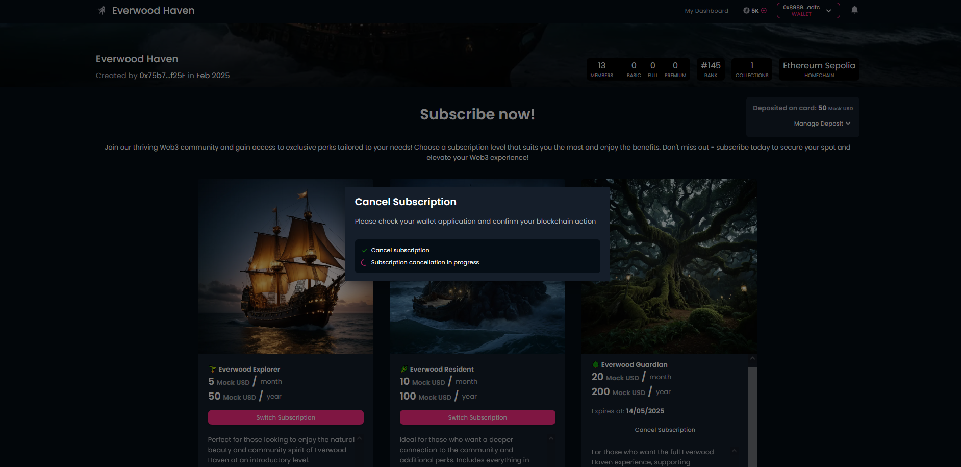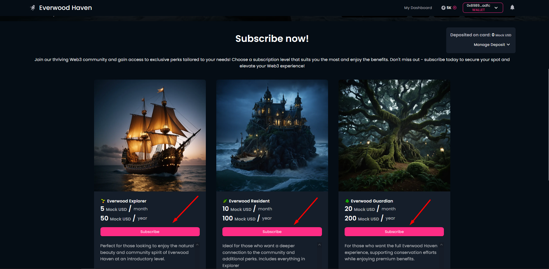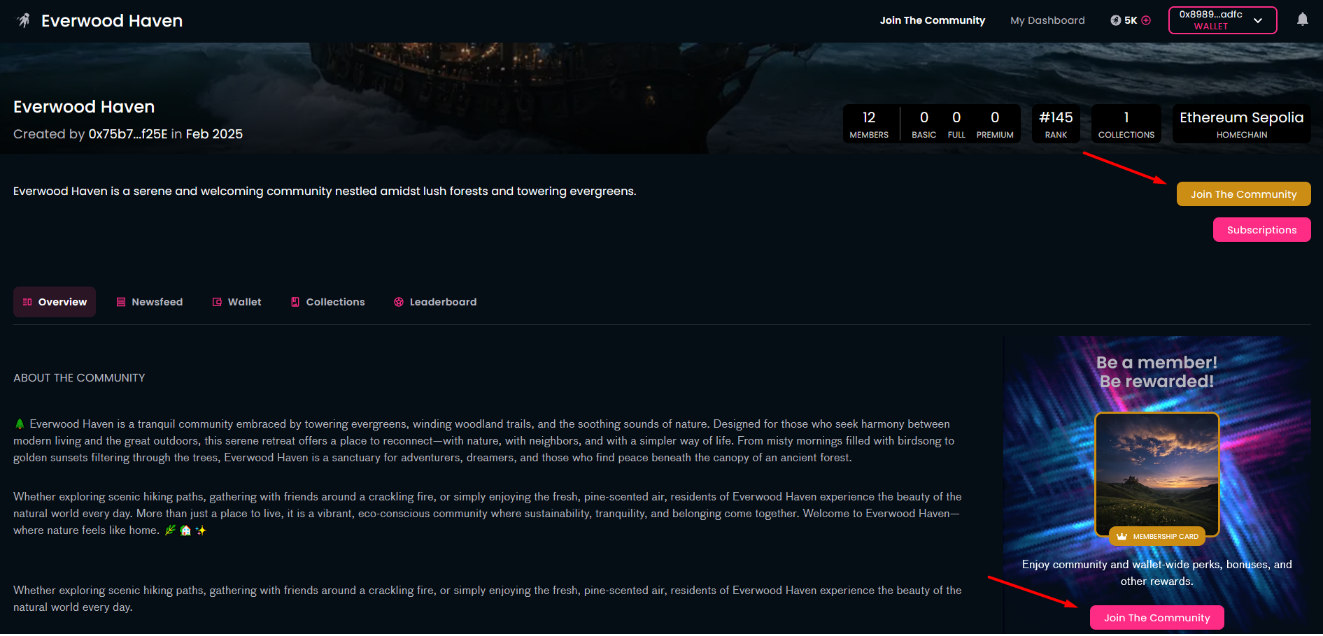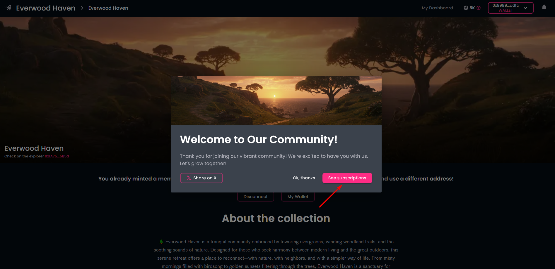 Before you can choose a specific subscription tier, you need to become a member in your selected community. If this is your first time with this community, click on the "Join The Community" button on the community page. This is the Web3 world: you'll need to connect your crypto wallet (if you had not done so before) and click on the "Mint" button to create ("mint") the token representing your membership, i.e., your membership card. Of course, you need to approve this transaction in your wallet.