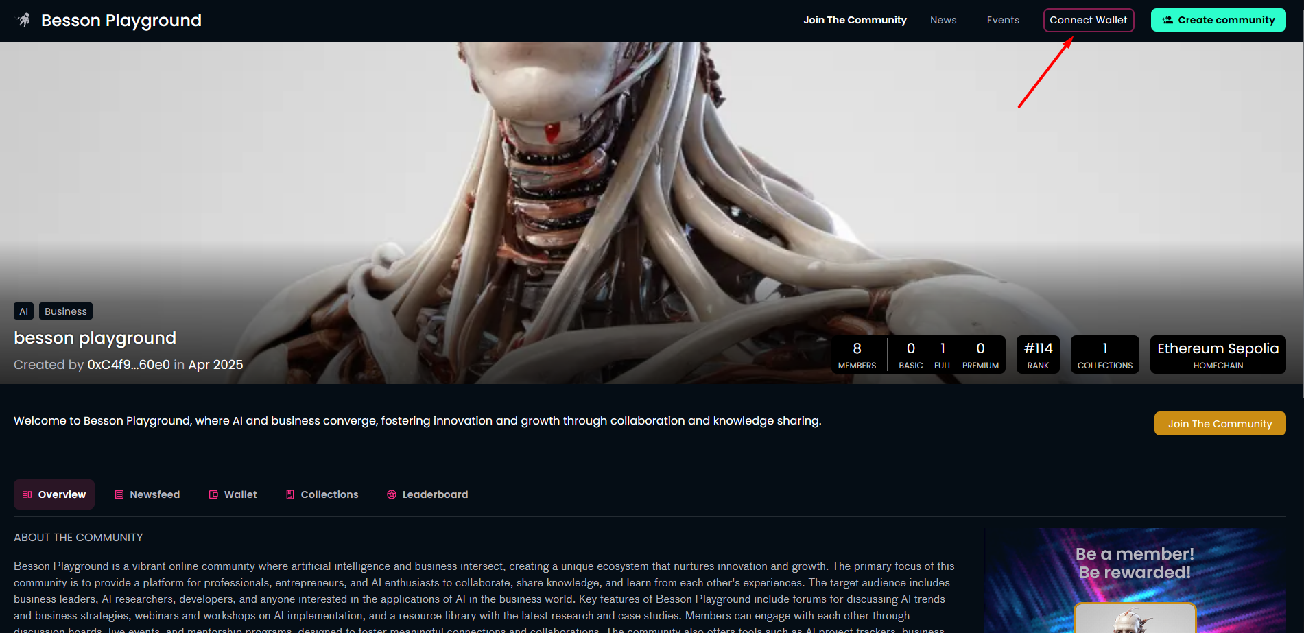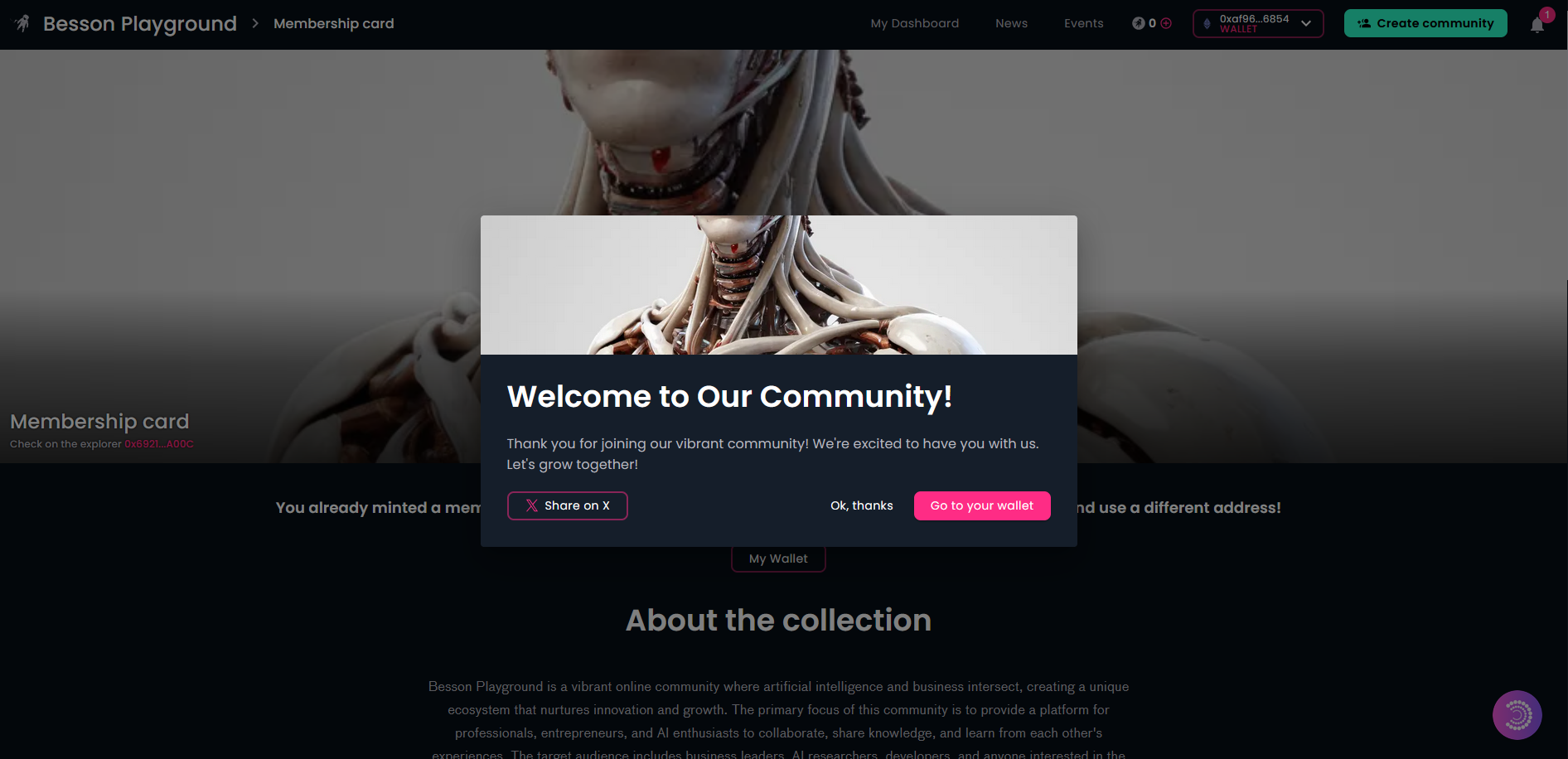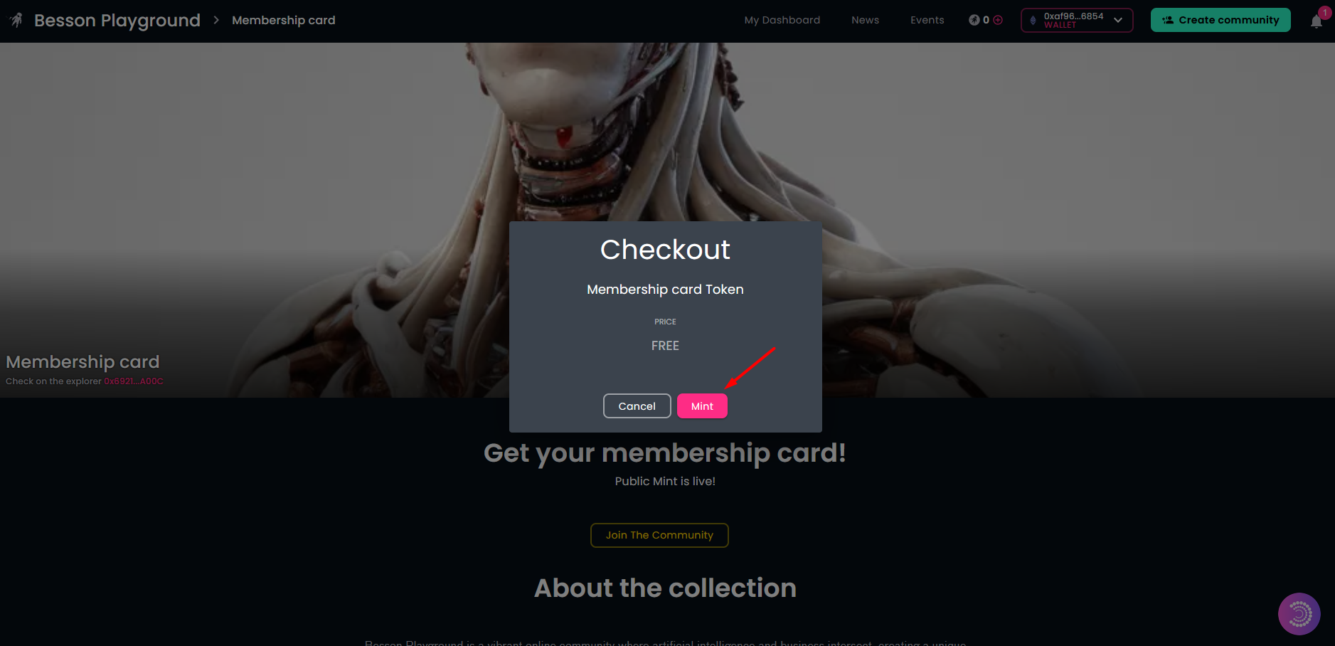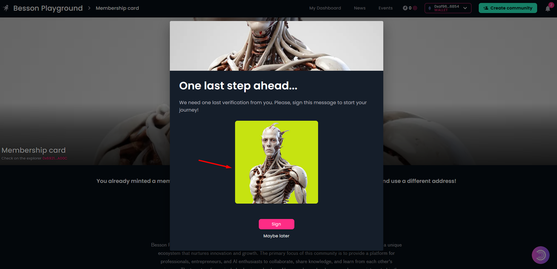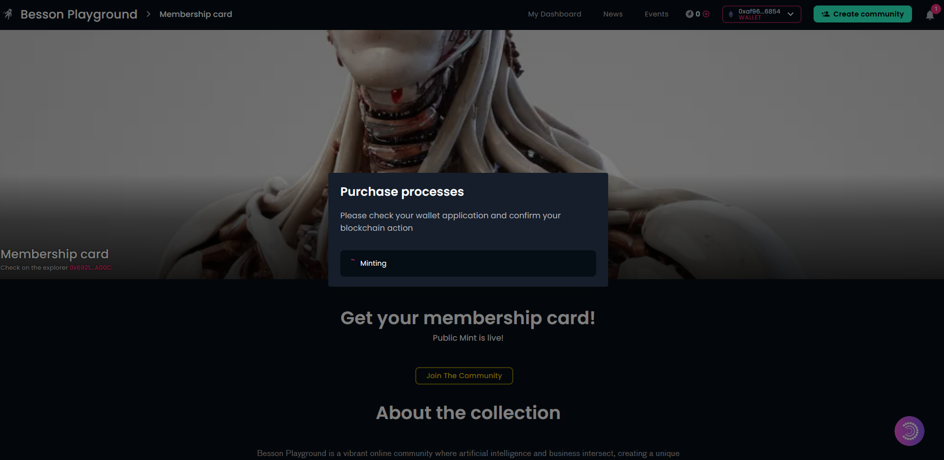 Here are several screenshots showing the implemented wallet abstraction functionality on a Galaxis community page from the perspective of a visitor who wants to acquire a community membership card.