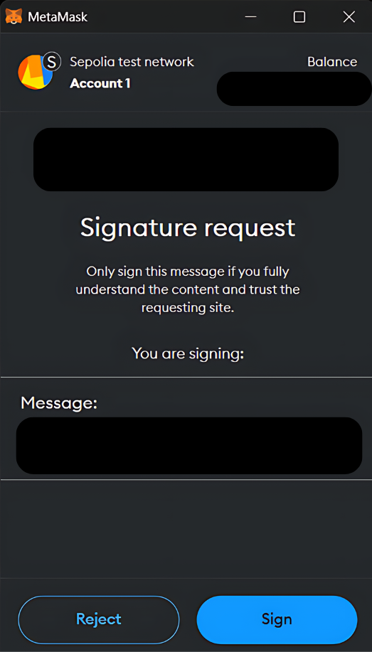 First we need your "signature". Not your physical one, but something equally strong and non-repudiable. This is done in your crypto wallet. For example, if you are using the MetaMask wallet, a little dialog window similar to this should open automatically (depending on your setup and browser, you may need to manually change over to that window):